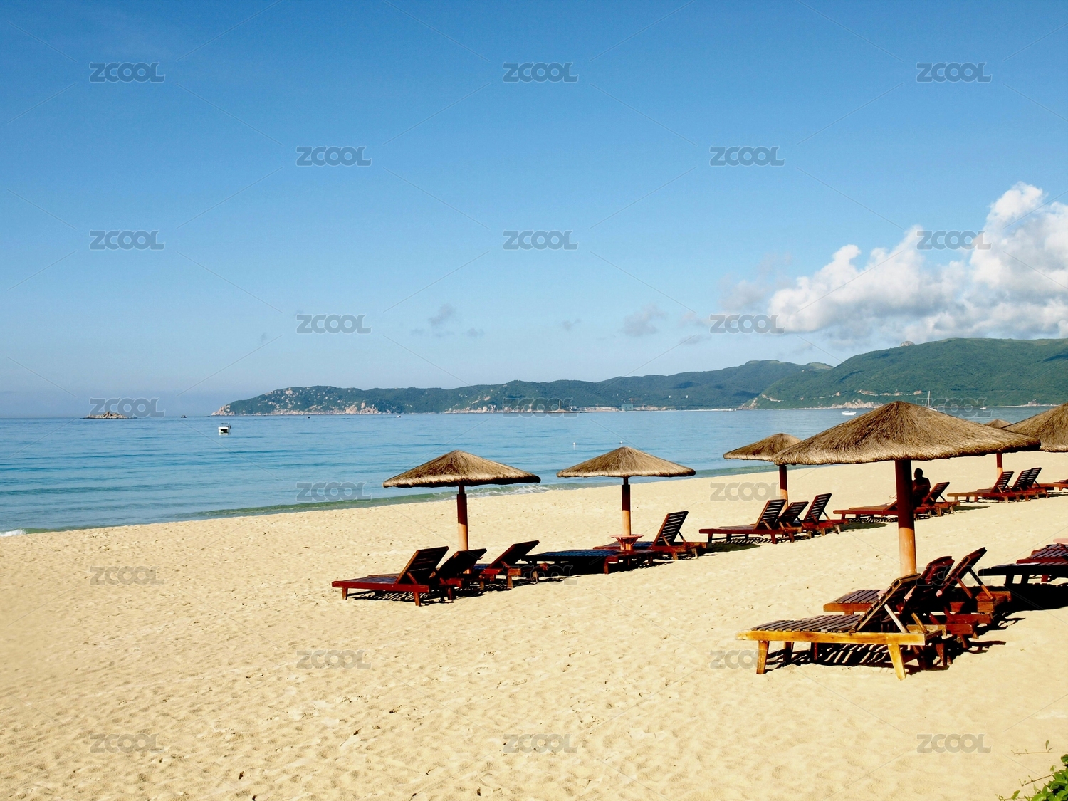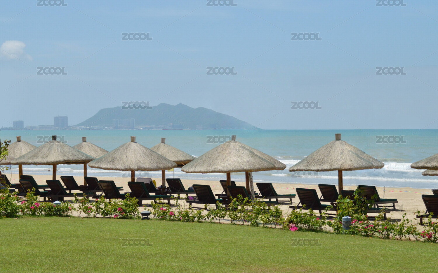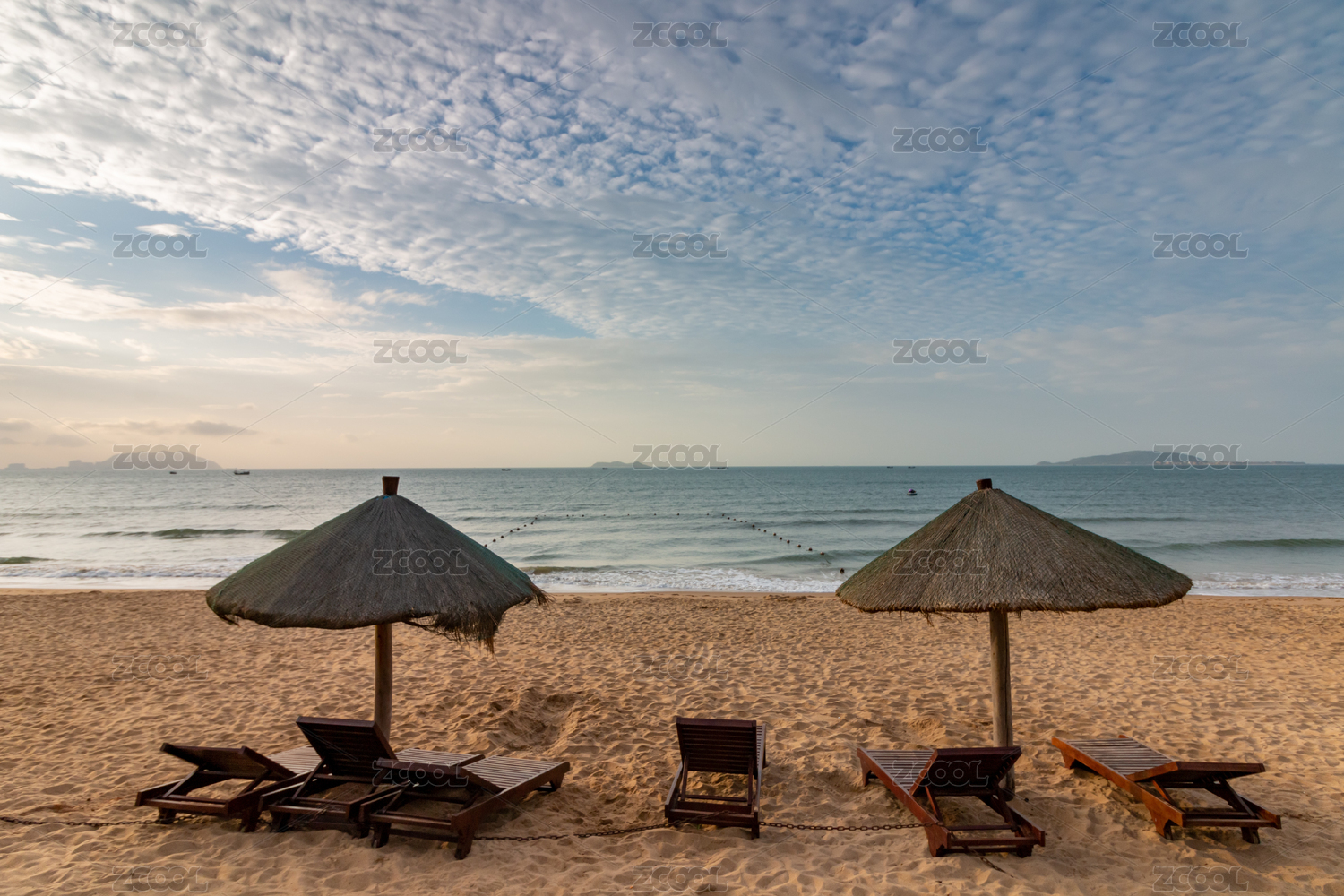 海南省三亚市亚龙湾休闲海滩上的遮阳棚和躺