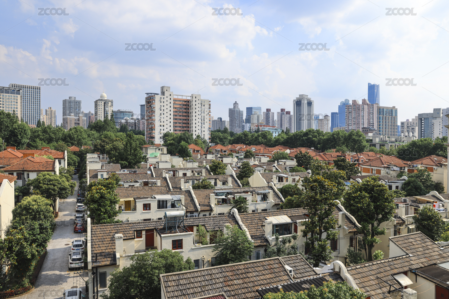 老上海的红色屋顶城市天际线