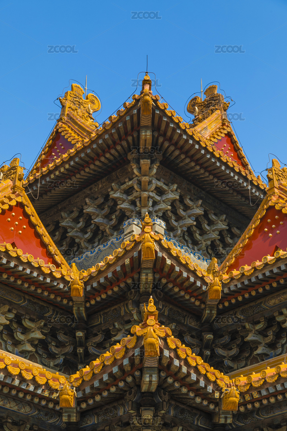 梅山寺宝殿上彩绘的飞檐斗拱建筑景观