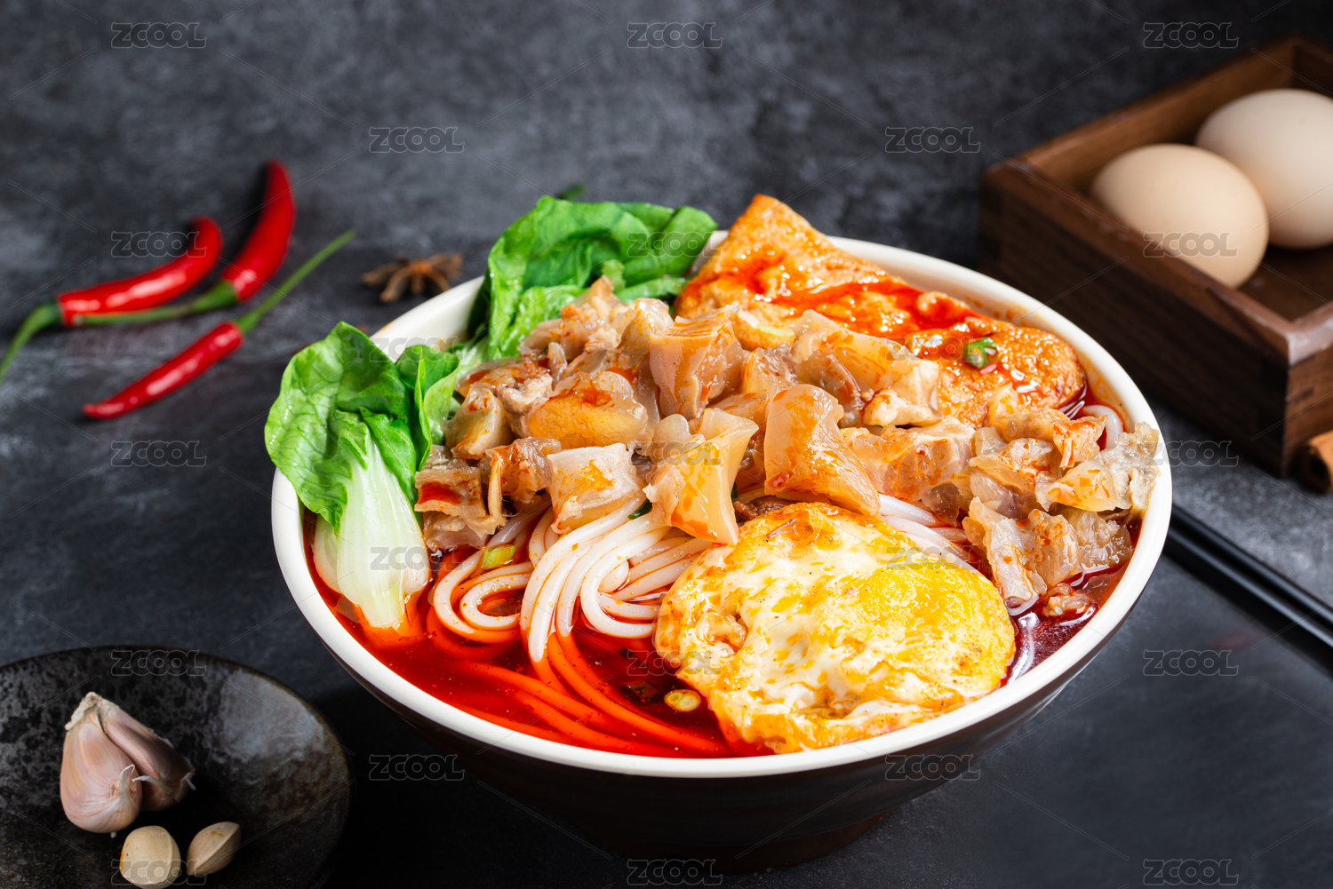 黑色背景上餐具里盛放的鸡丁米线泡馍