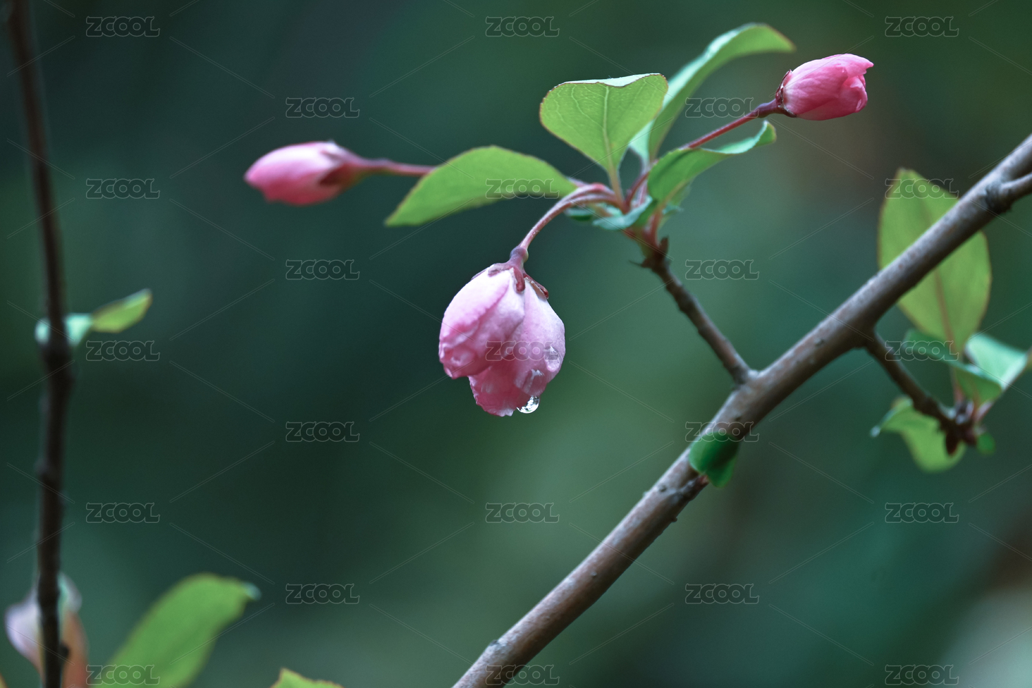 海棠花,粉色,特写,枝,叶,花簇,前景聚焦,春天,雨天,清新