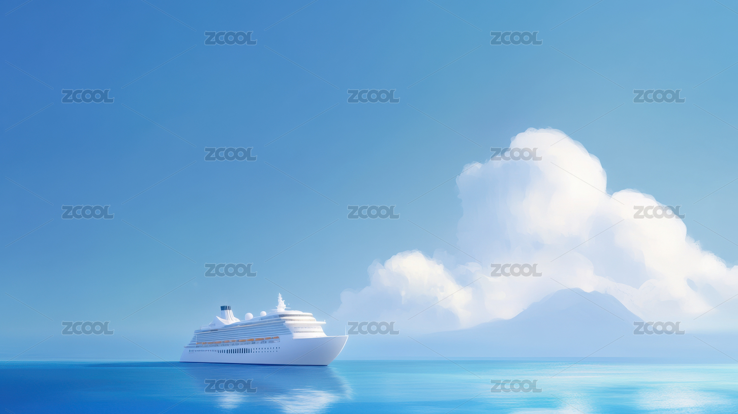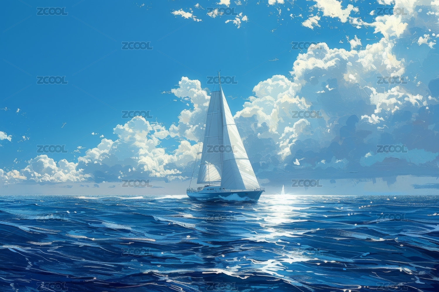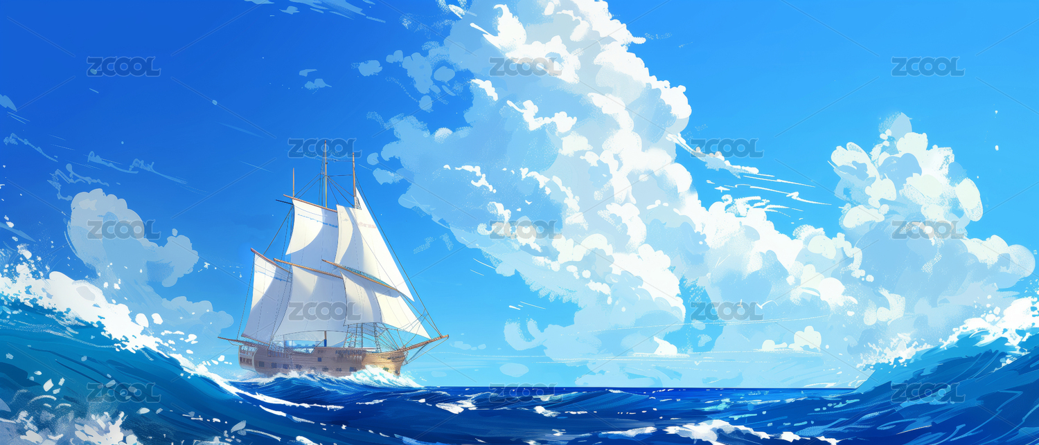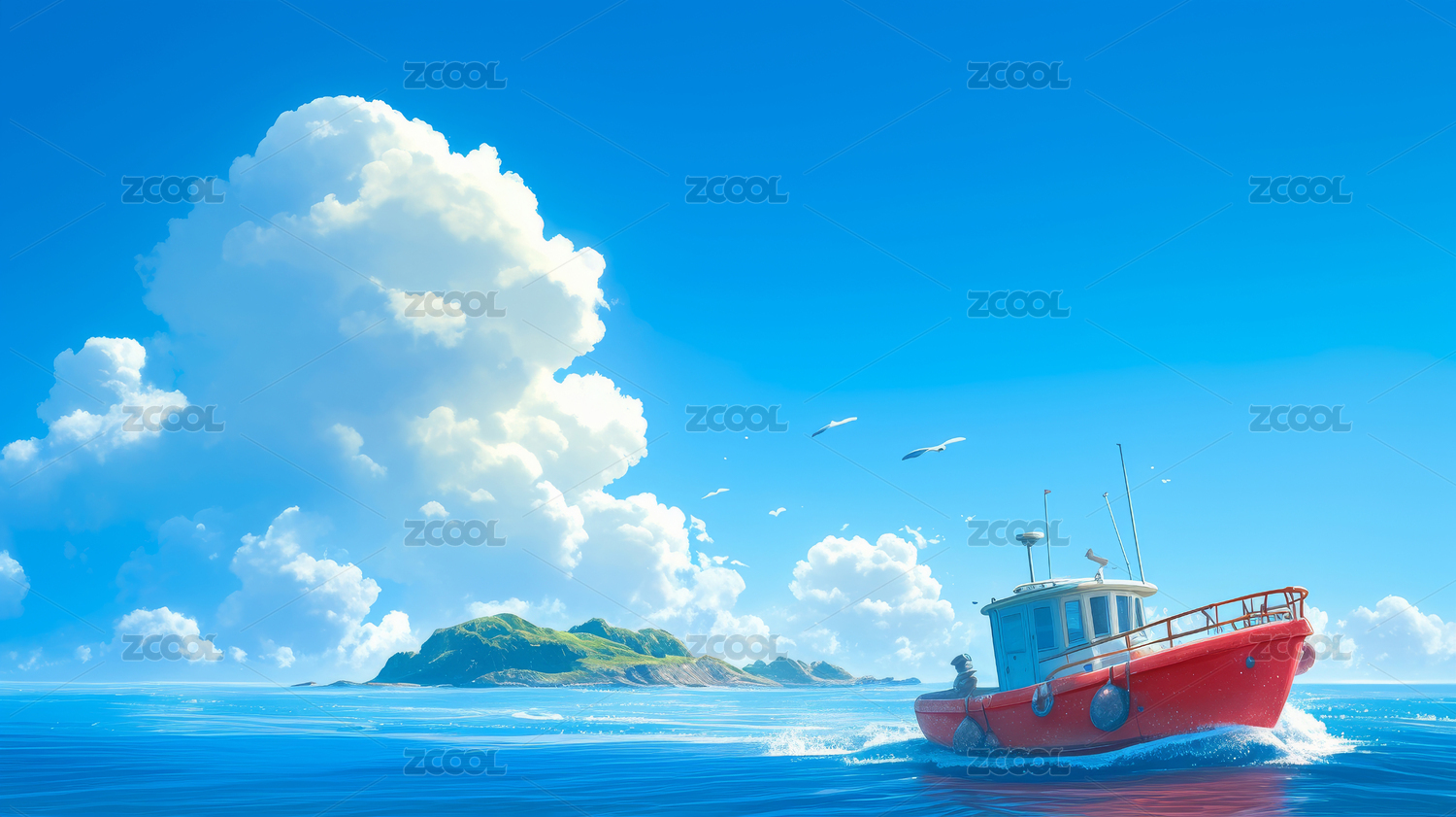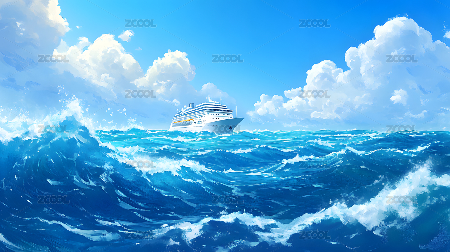大海,海浪,海洋,风景,天空,船,小船,卡通,插画