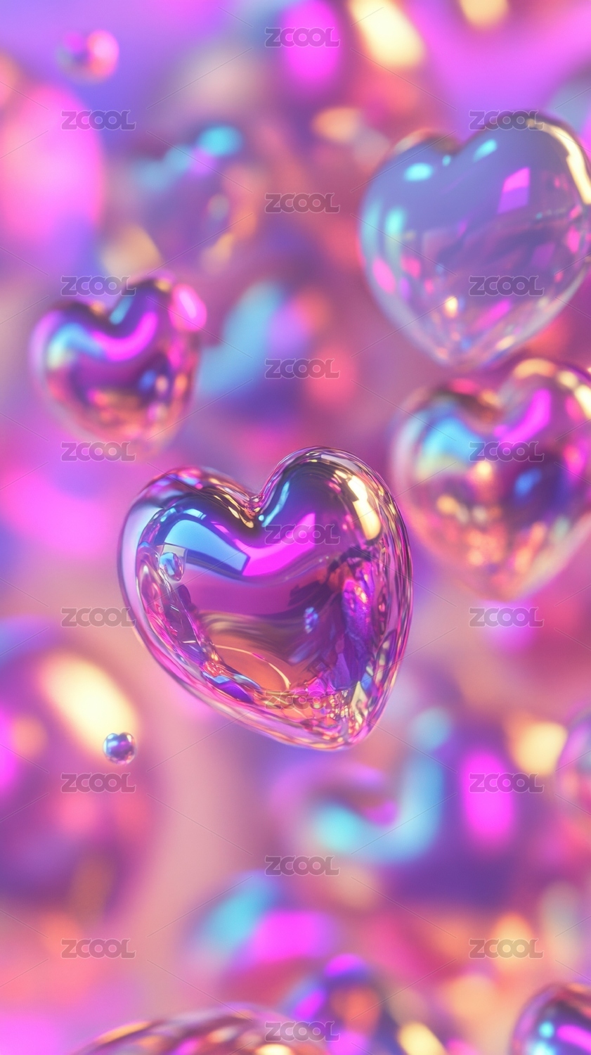 漂浮的彩色透明心形气泡