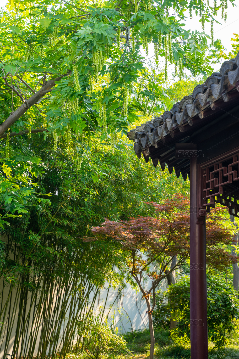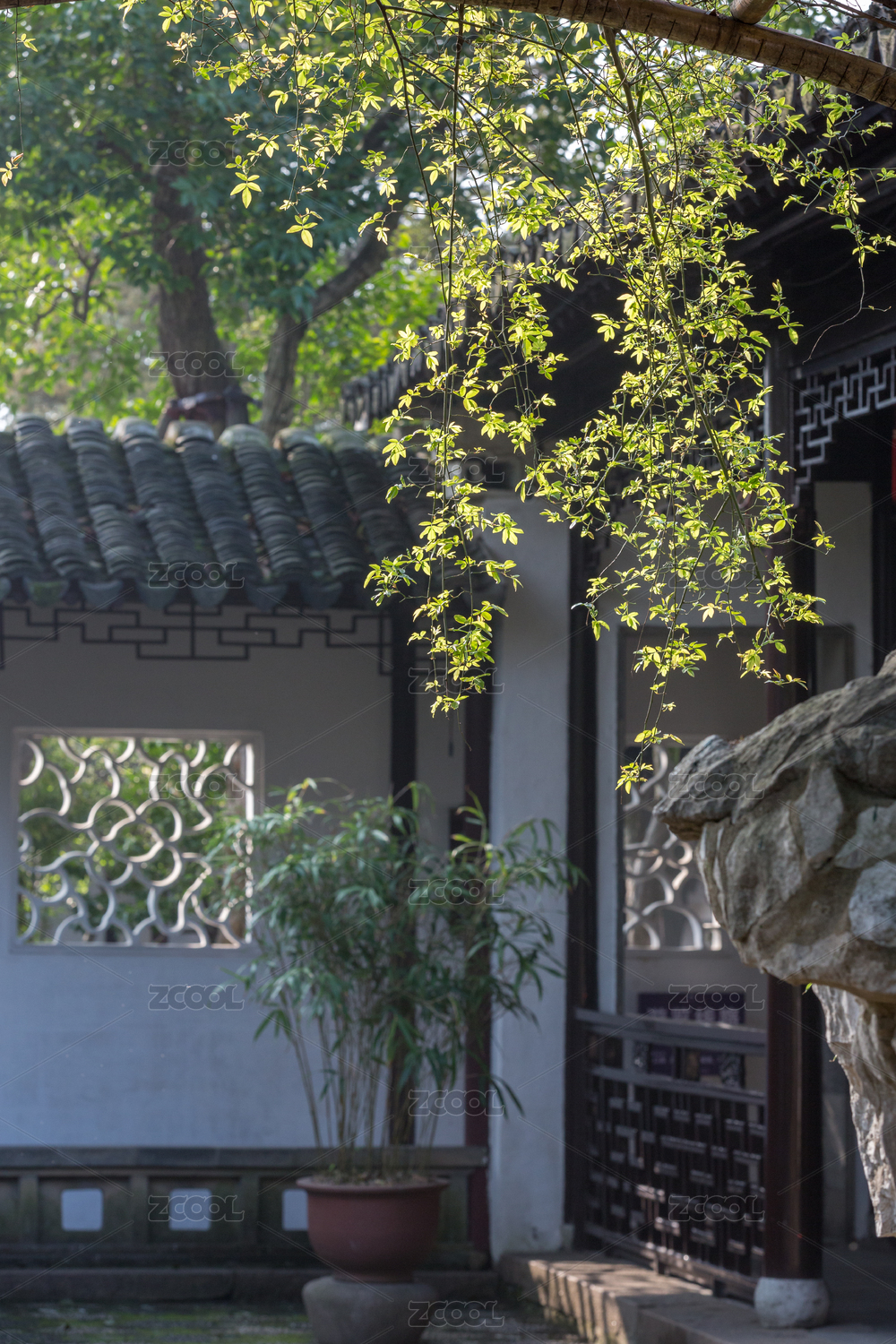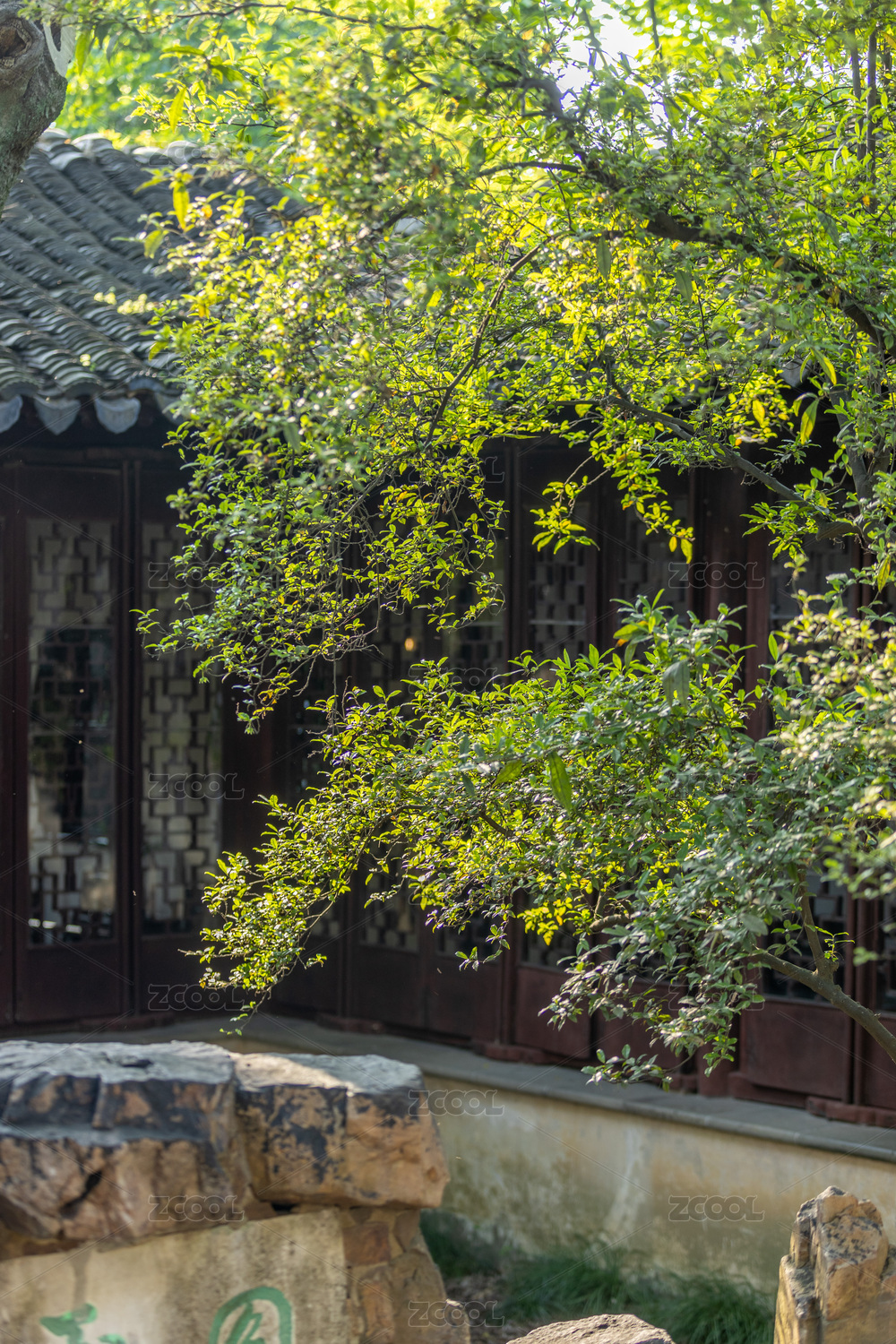 中国苏州园林清幽的自然风光,古建筑与绿树