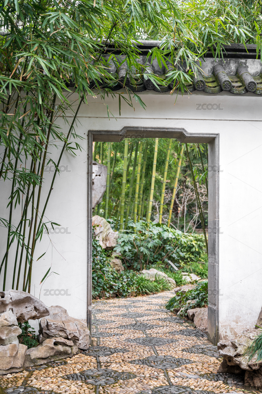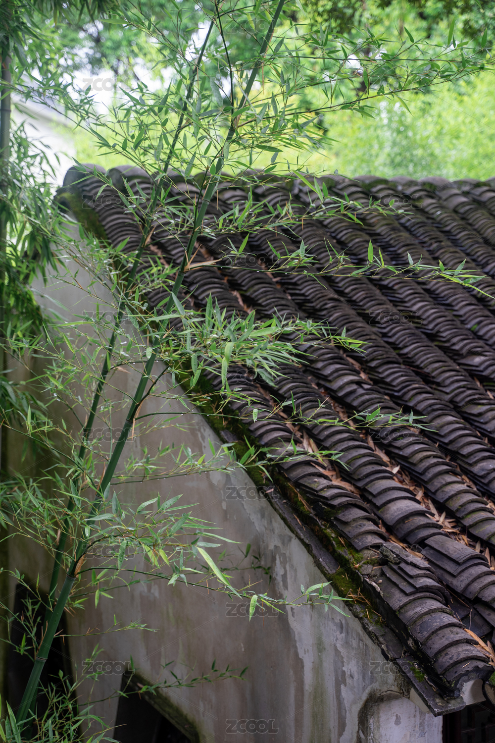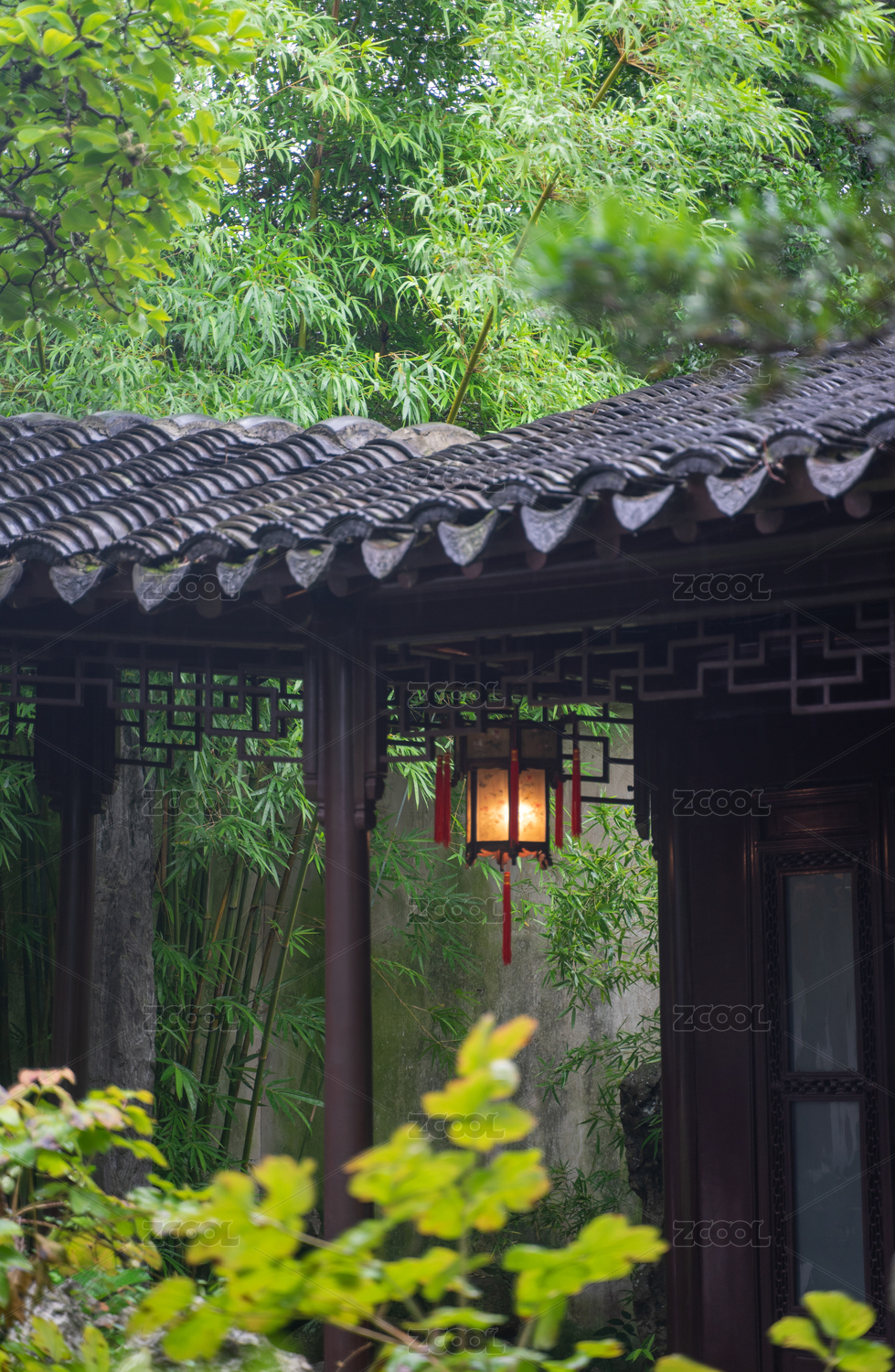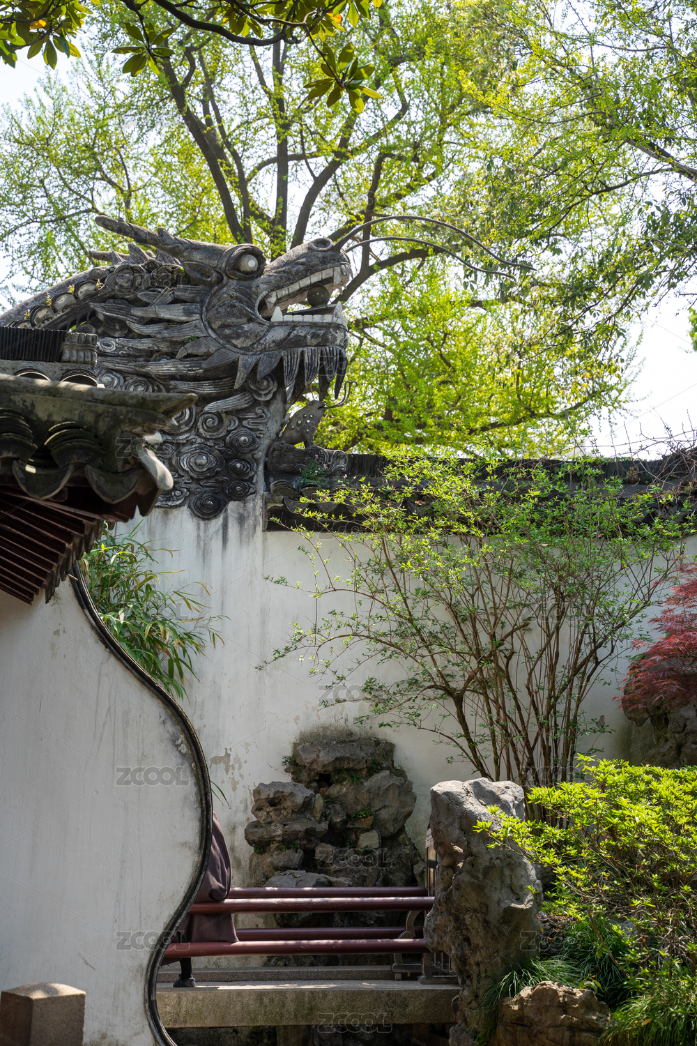 中国苏州园林清幽的自然风光,古建筑与绿树