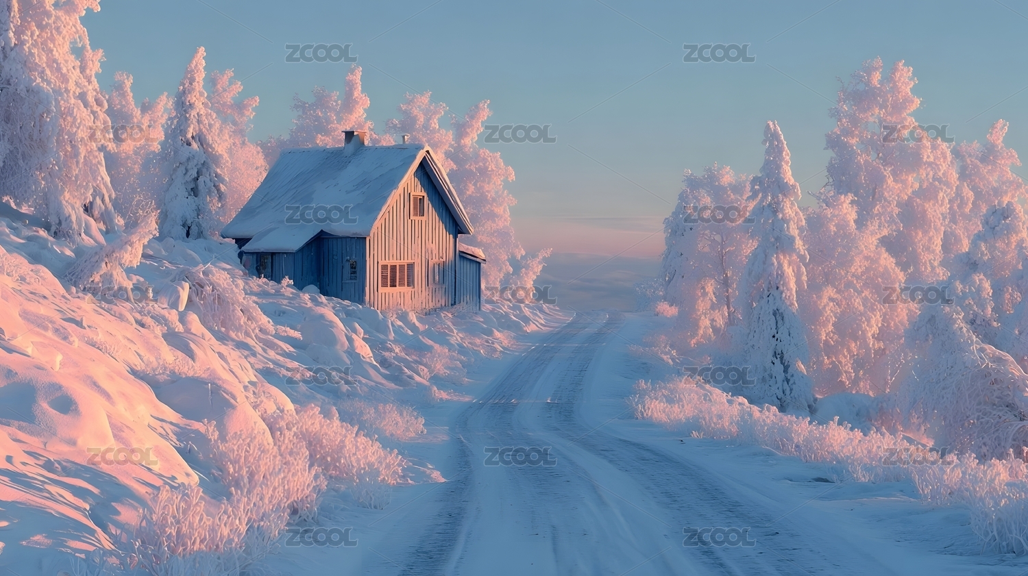 冬日白雪覆盖的林间乡村原野风景壁纸