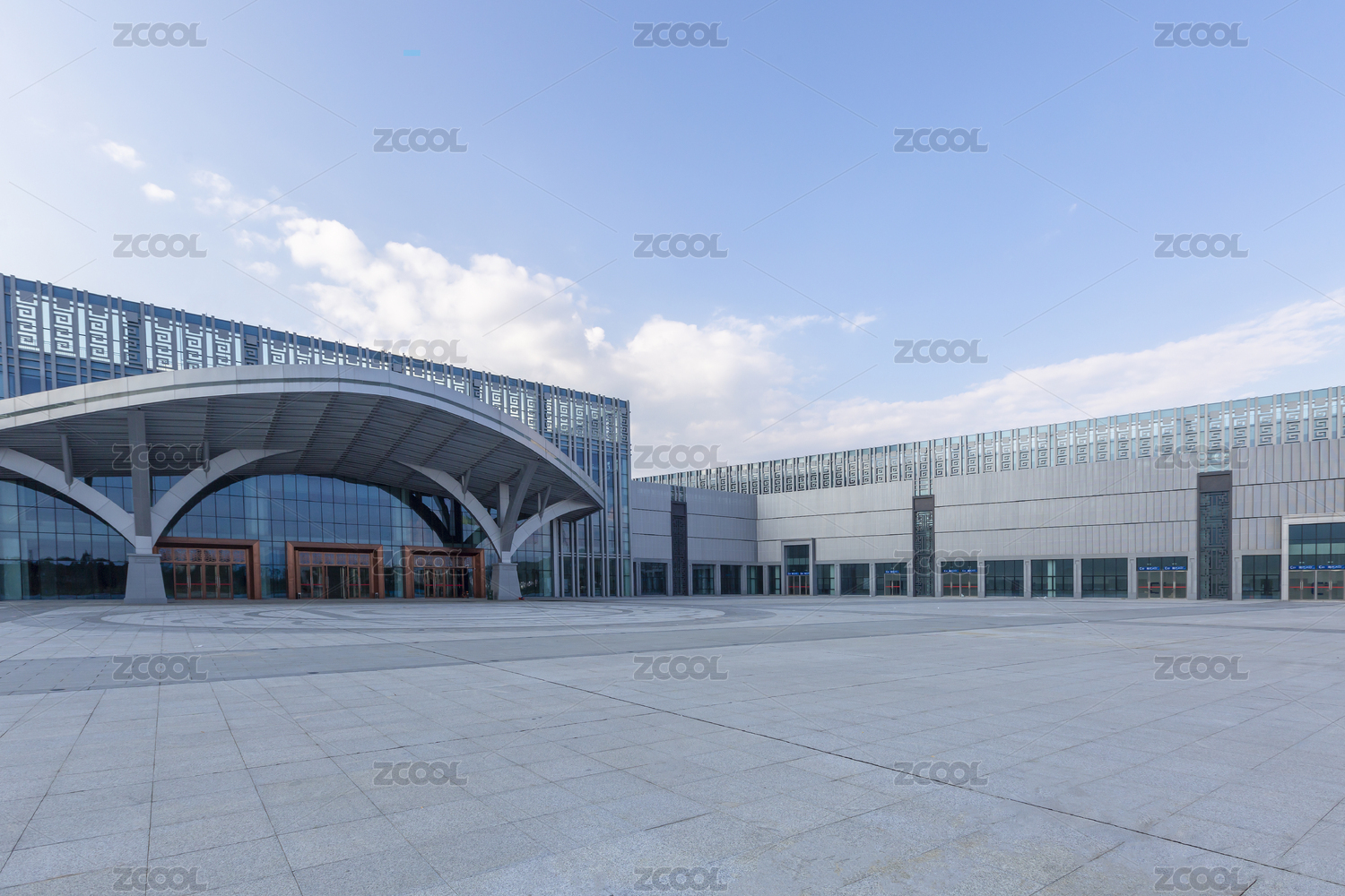 夕照下中国福建龙岩会展中心一现代化建筑外面开阔的空的大理石地面