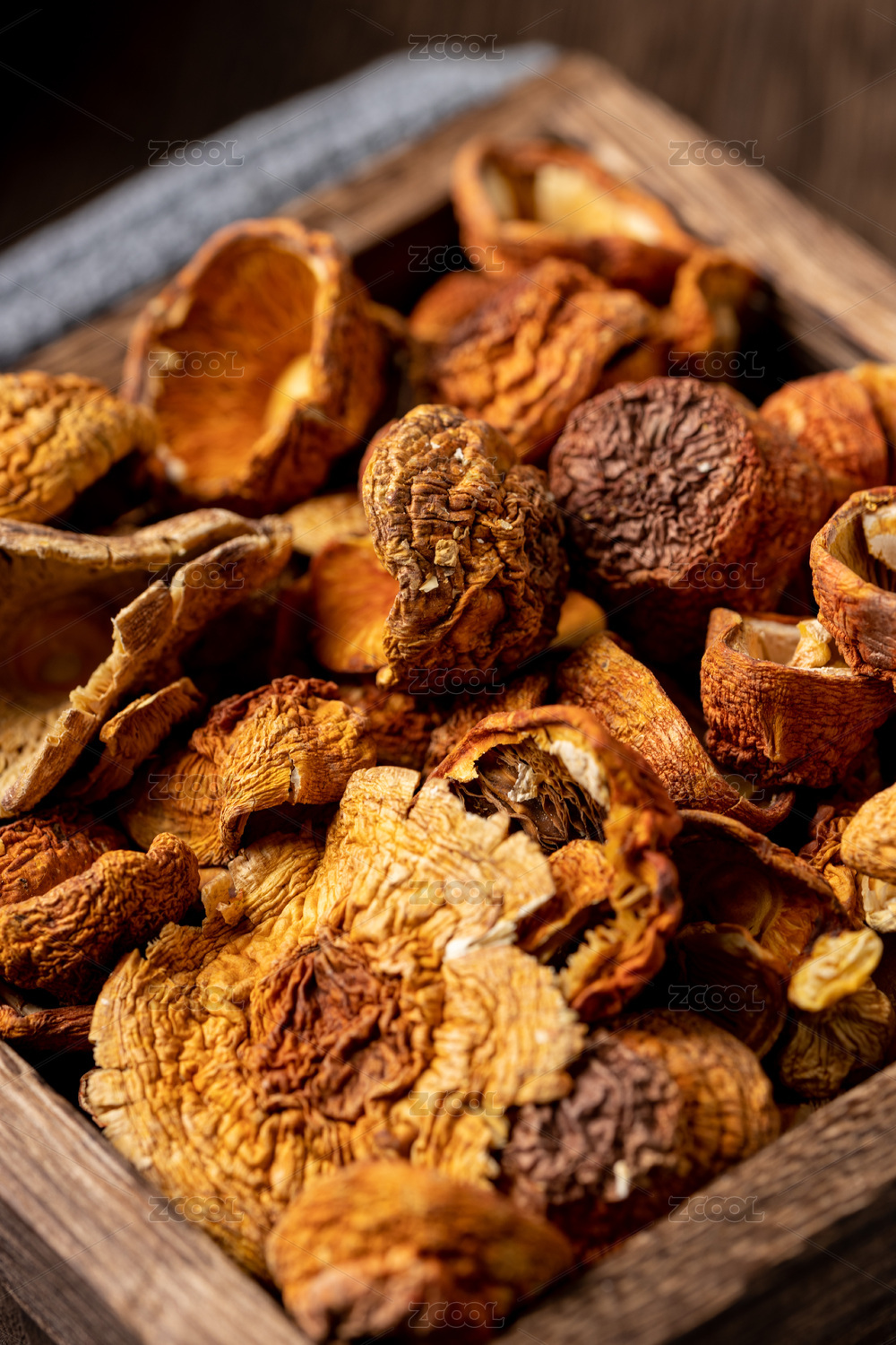 木纹背景上餐具里盛放的榛蘑菌菇干