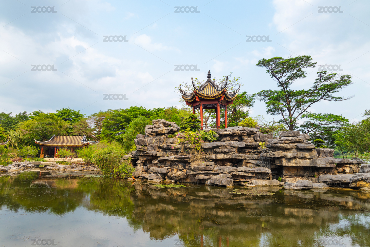 中国南方园林中的池塘假山和凉亭