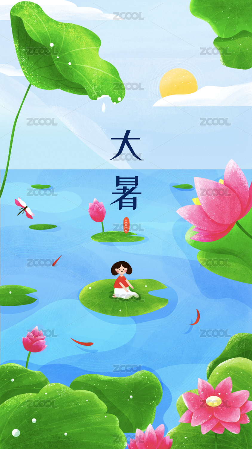 插画大暑绿色荷花女孩河边鱼蜻蜓露珠坐着