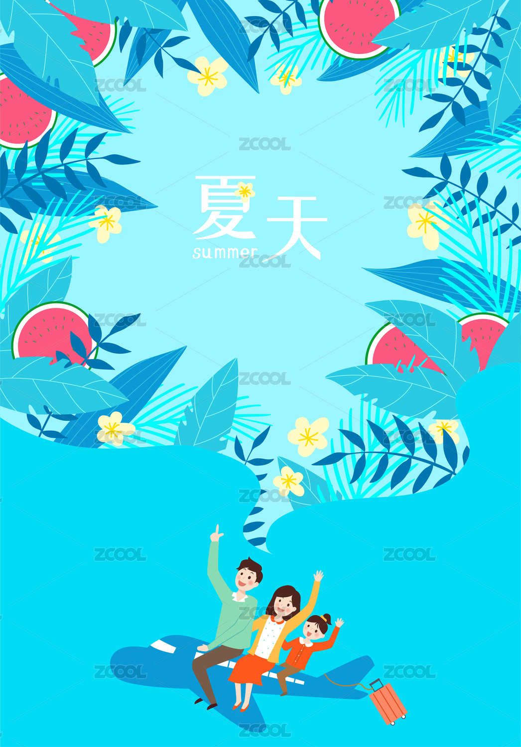 夏季清凉一家人坐飞机旅行避暑植物插画