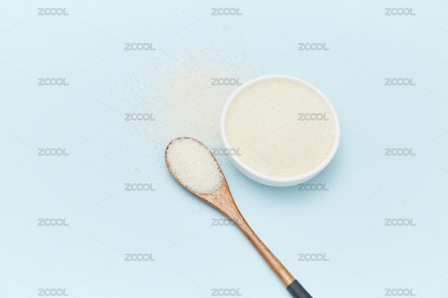 蓝色桌面上摆放着的调料美食白糖白砂糖