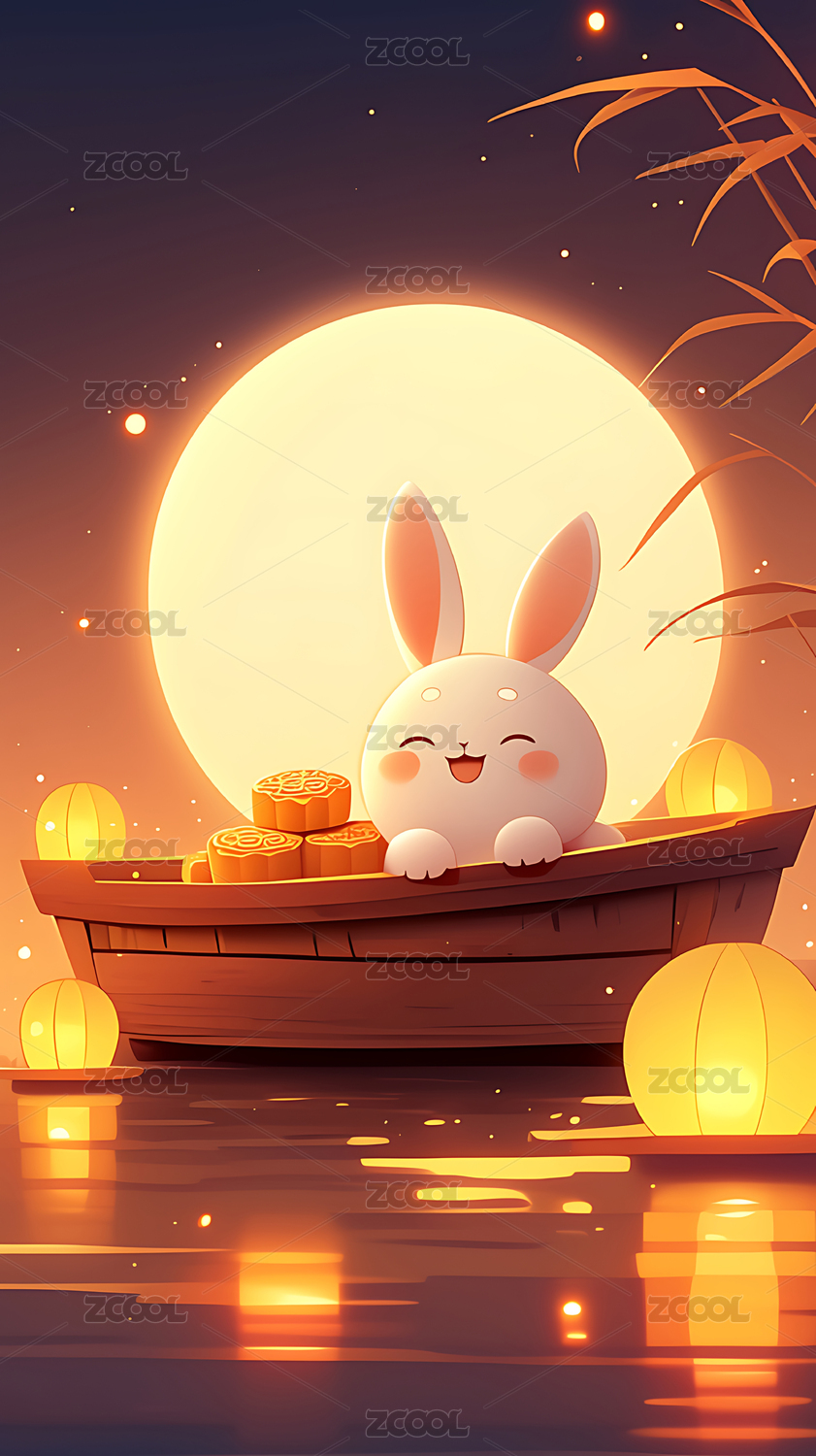 中秋节月亮玉兔抱着月饼赏月场景概念插图