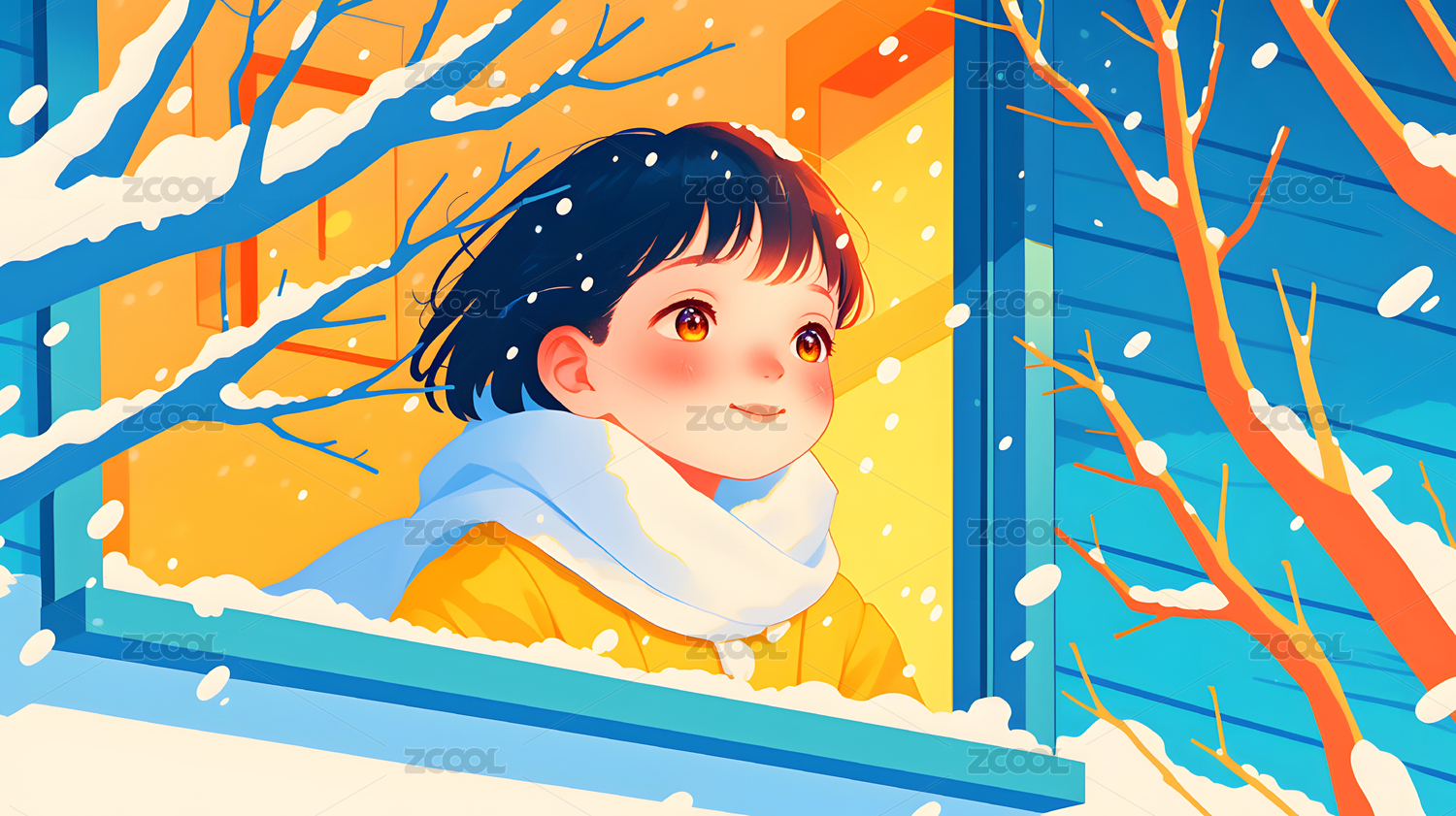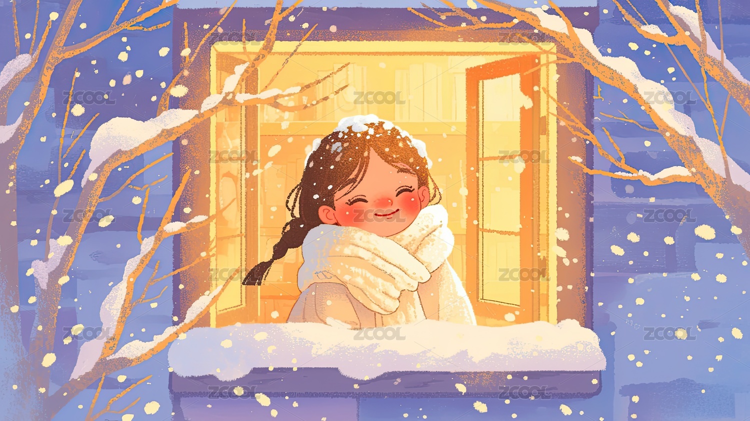 冬日窗边的女孩唯美插画