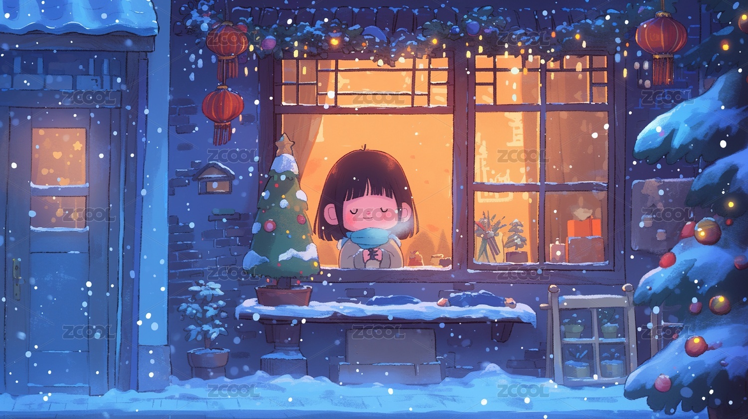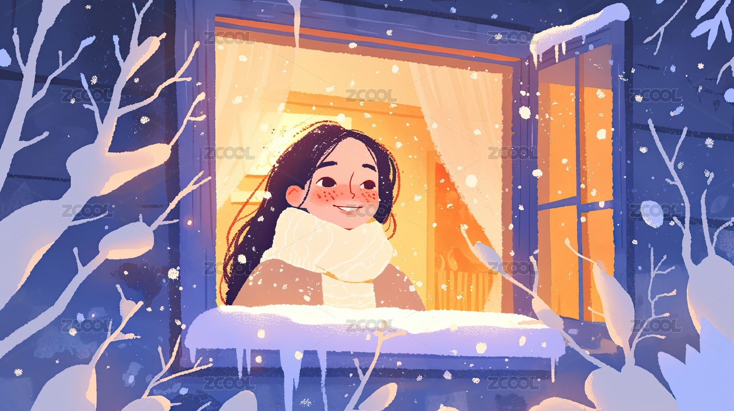 女孩雪夜窗边场景