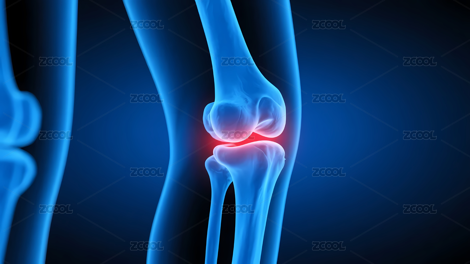 蓝色人类腿部膝盖骨骼的3D医学插图