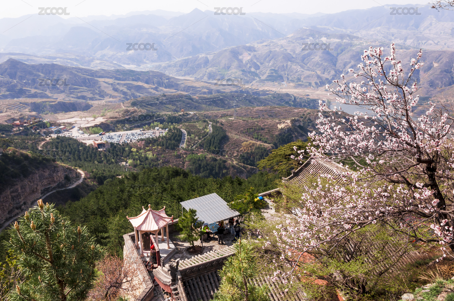 中国山西北岳恒山樱花下的寺庙庭院风光