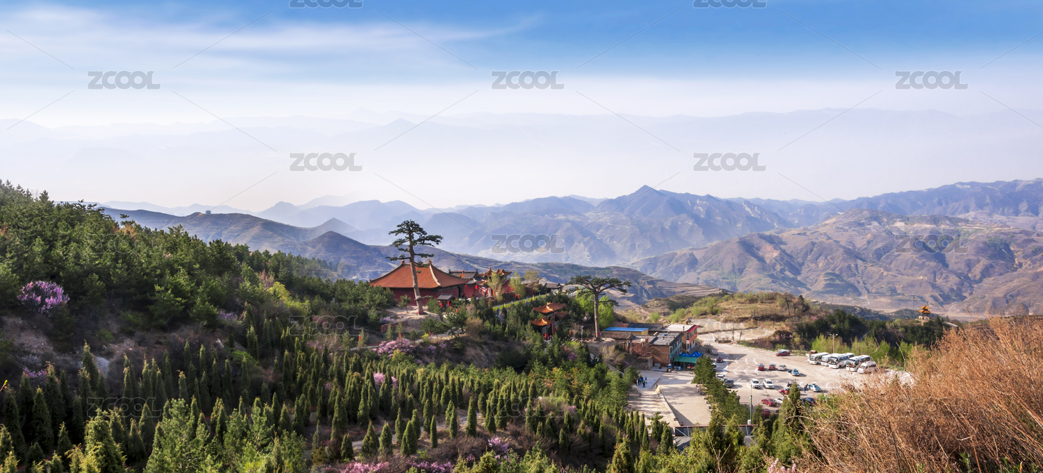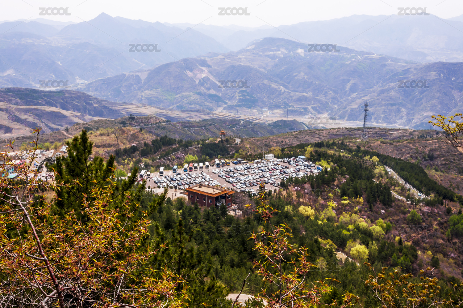 中国山西北岳恒山山顶车场及寺庙群山风光