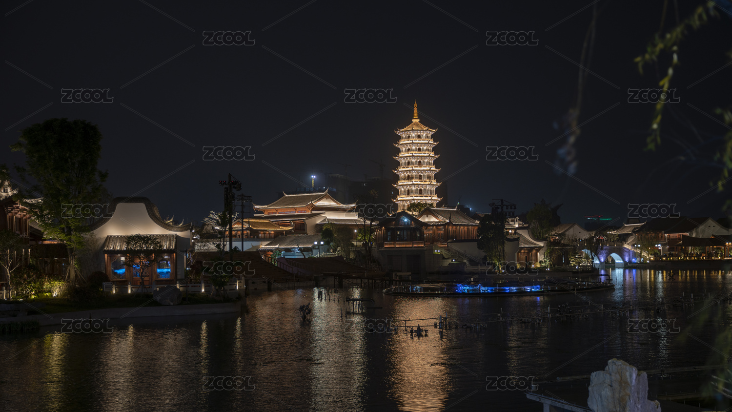 浙江湖州龙之梦太湖古镇夜晚航拍