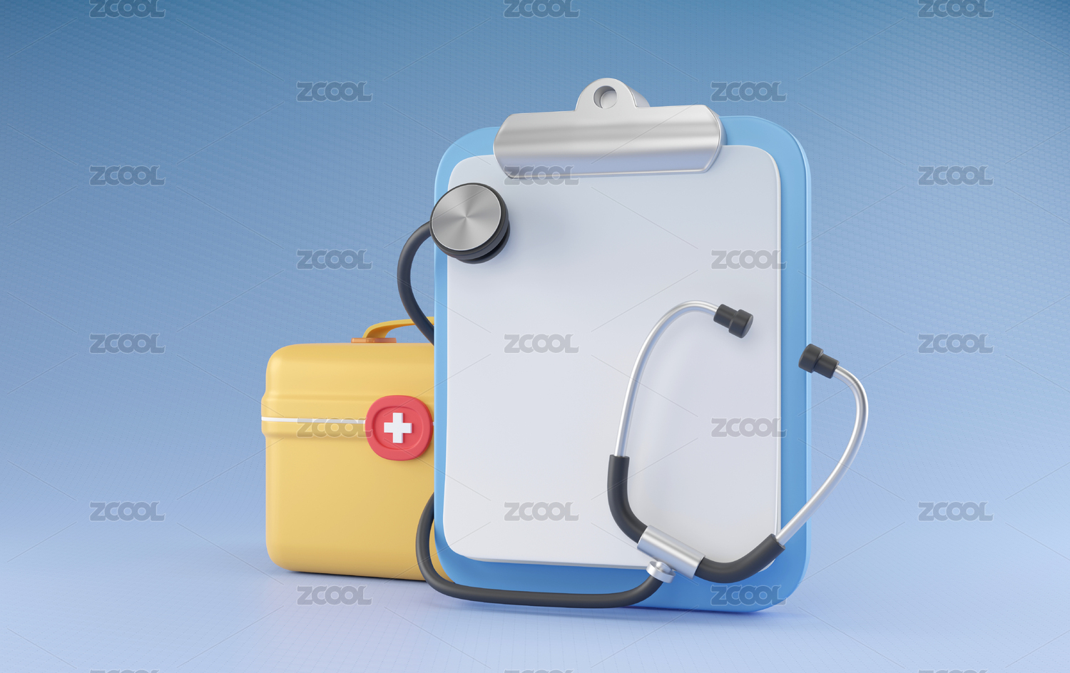 蓝色报告夹与听诊器药箱组合健康医疗素材