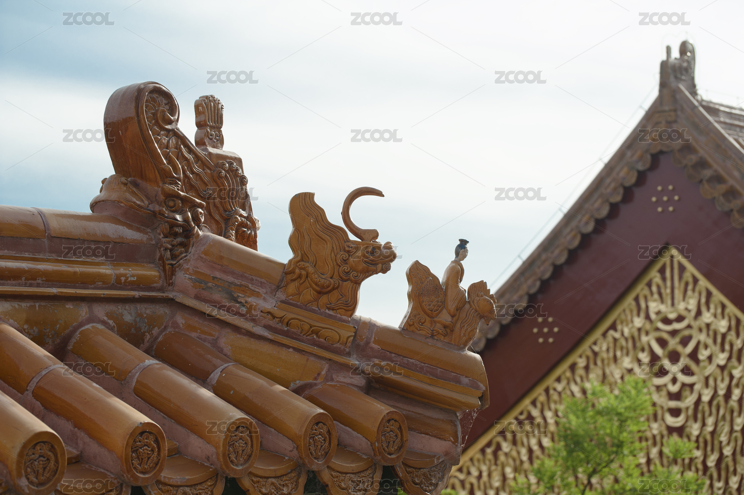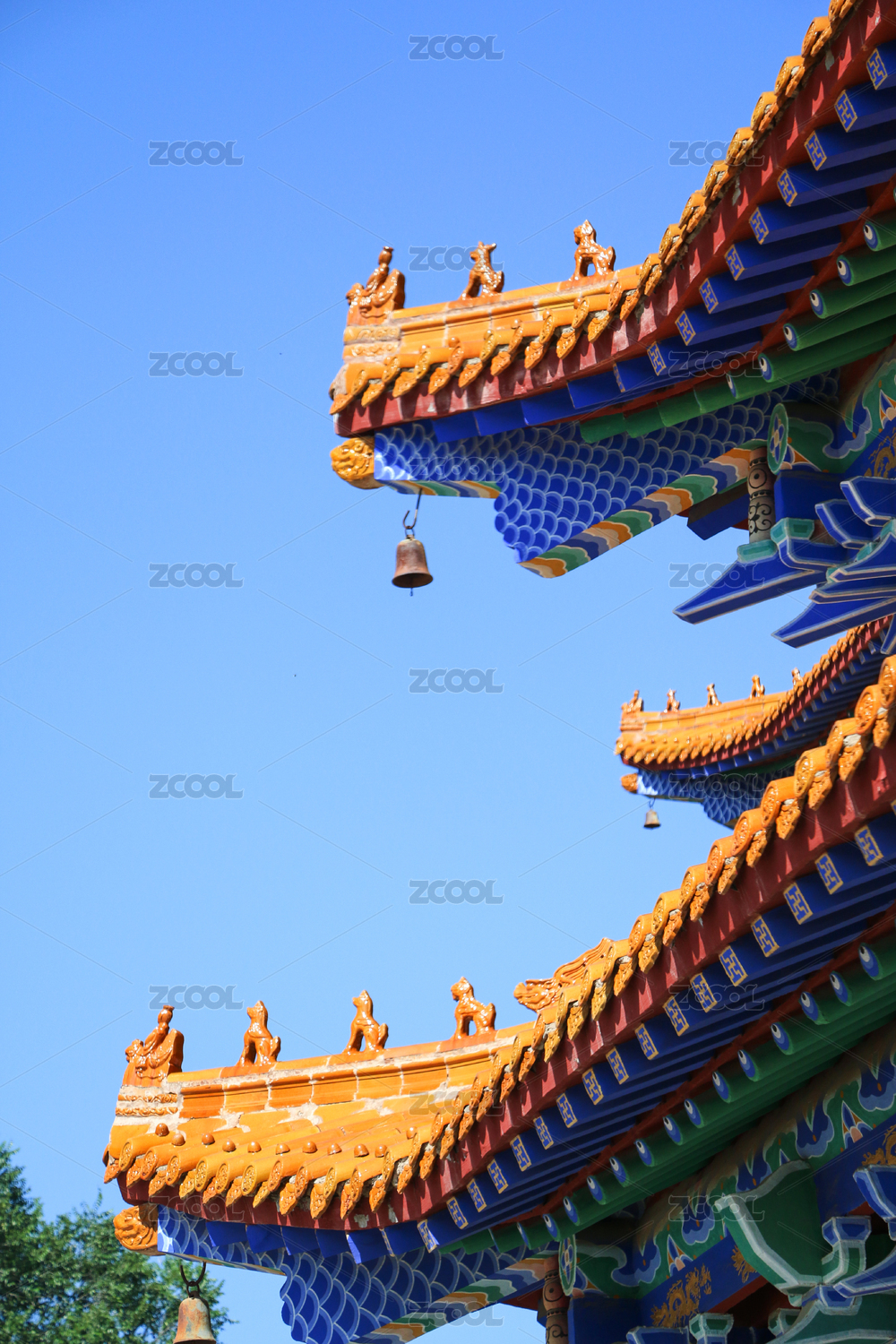 故宫宫殿屋顶上的鸱吻与绿色黄色琉璃瓦