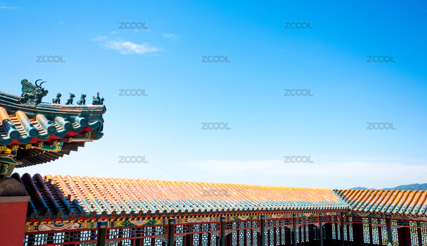 中国北京颐和园皇家古建一角——琉璃瓦瑞兽斗拱彩绘描金