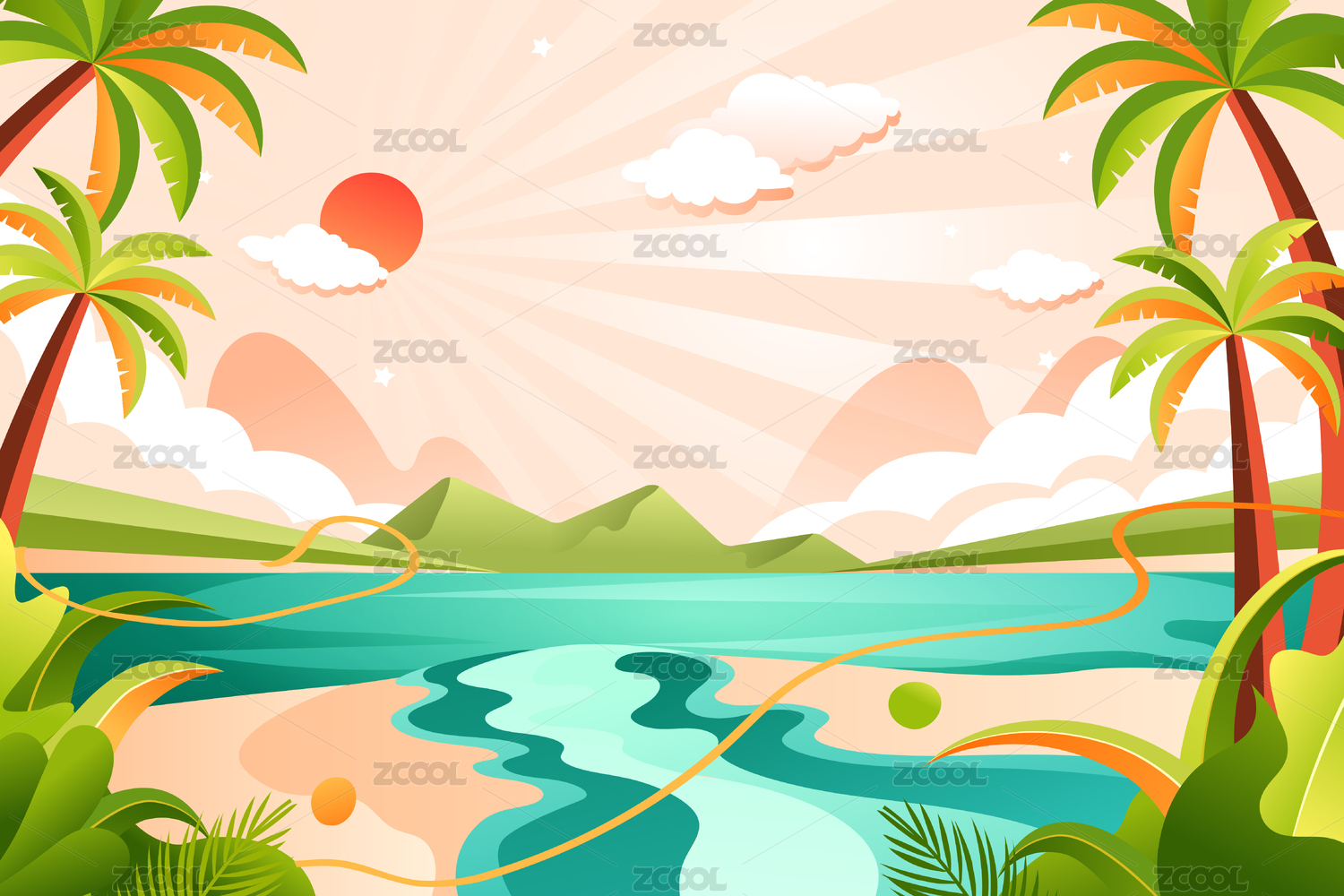 绿色清新户外一轮圆月倒影江边的扁平插画