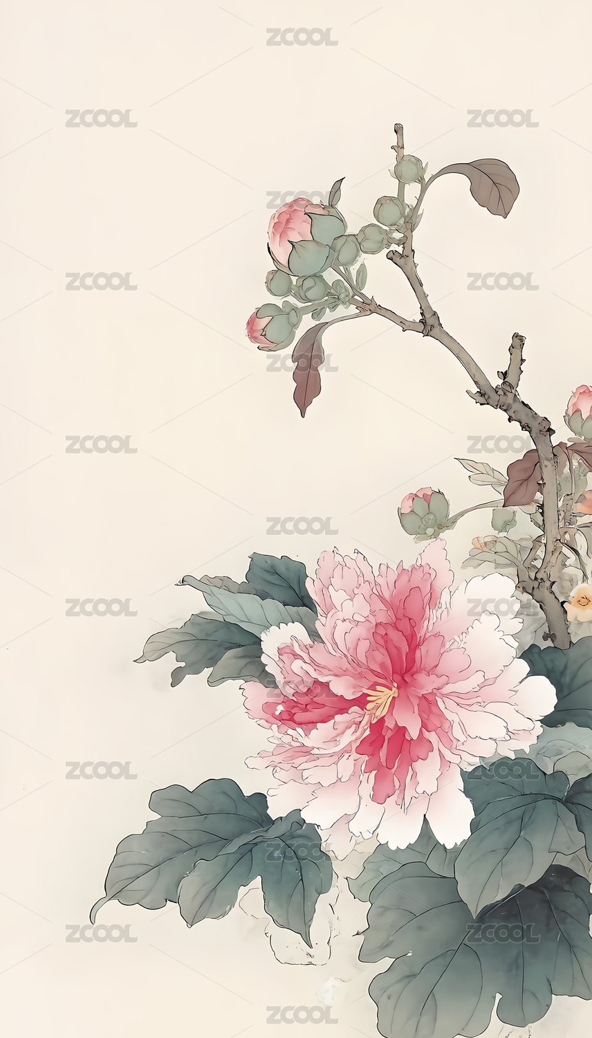 淡彩牡丹水墨花卉壁纸背景