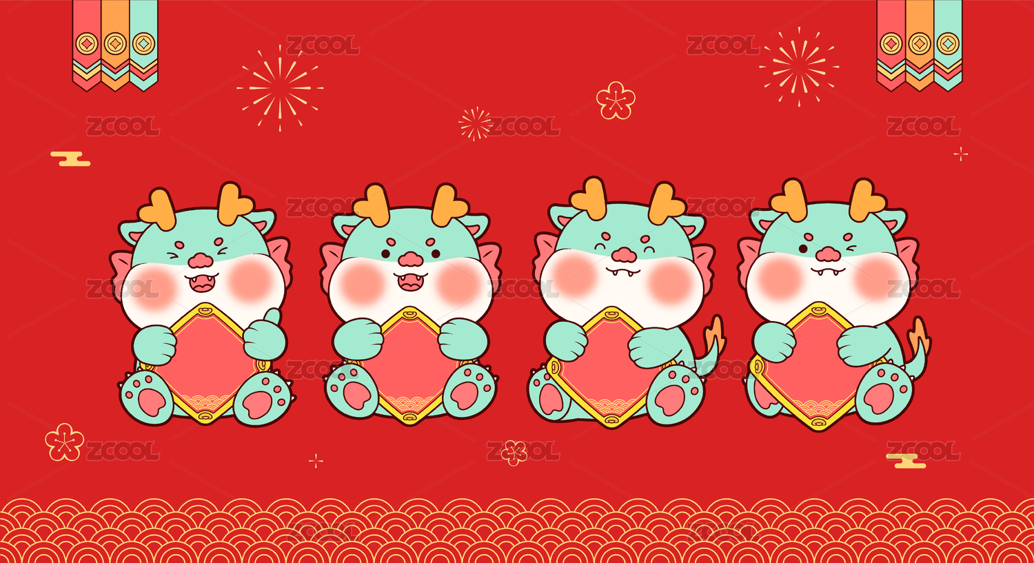龙,龙年,卡通,财神,国潮,国风,插画,矢量,横版,喜庆