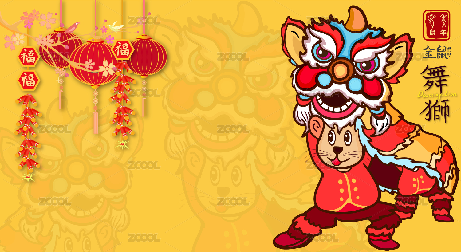 卡通的小老鼠在舞狮,庆祝新年2020年鼠年春节海报插画背景
