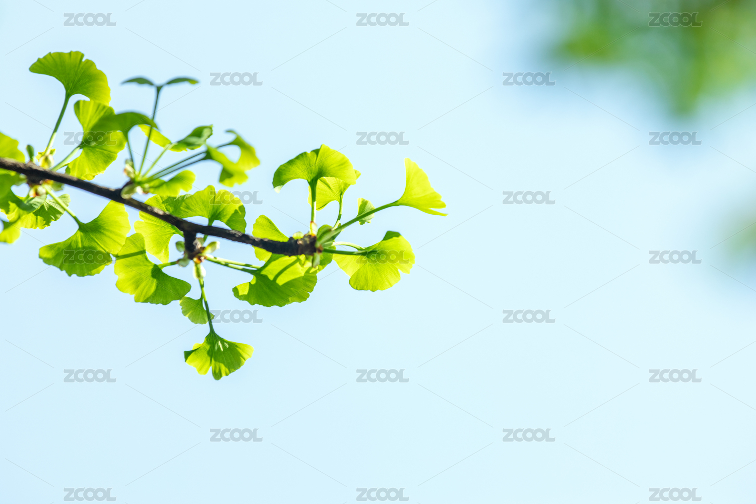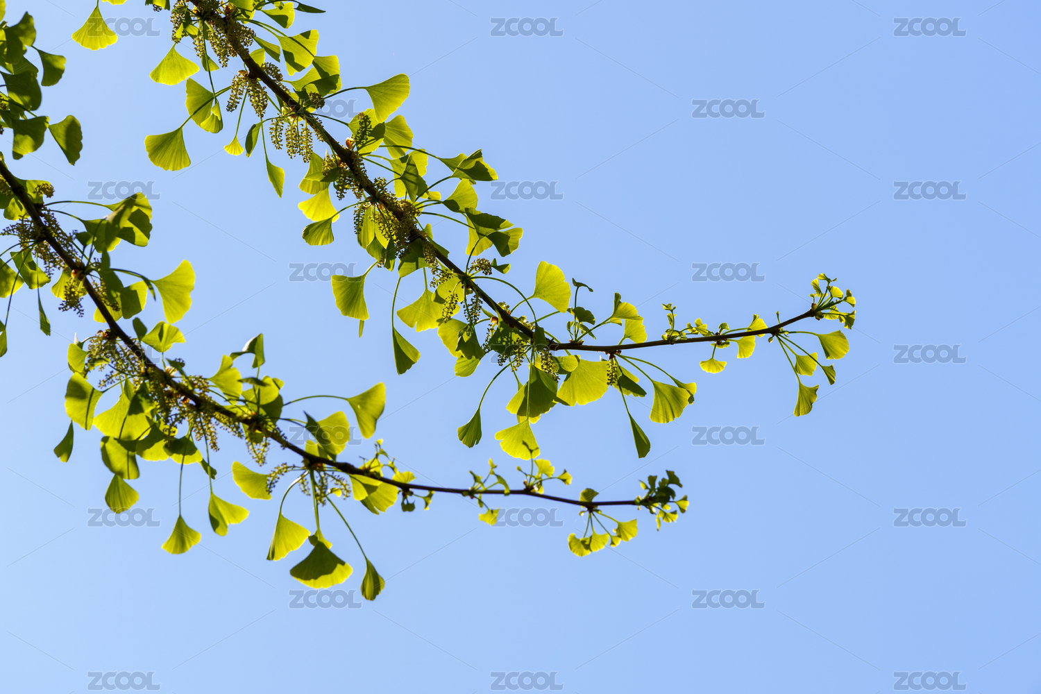 春天蓝天下一颗大树的叶子发出了嫩芽