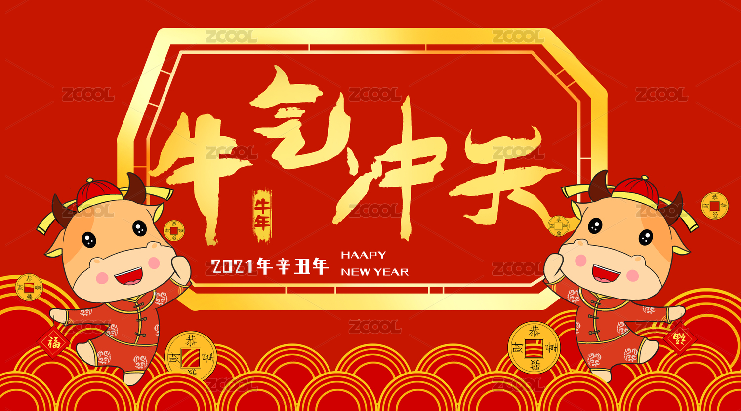 2021牛年牛气冲天横版红色背景海报
