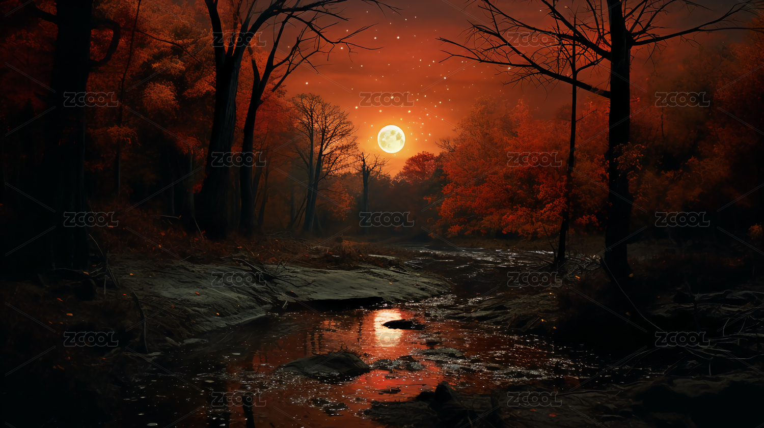 秋天,夜晚,森林,秋叶,小河,月光,神秘,宁静,树梢,丛林
