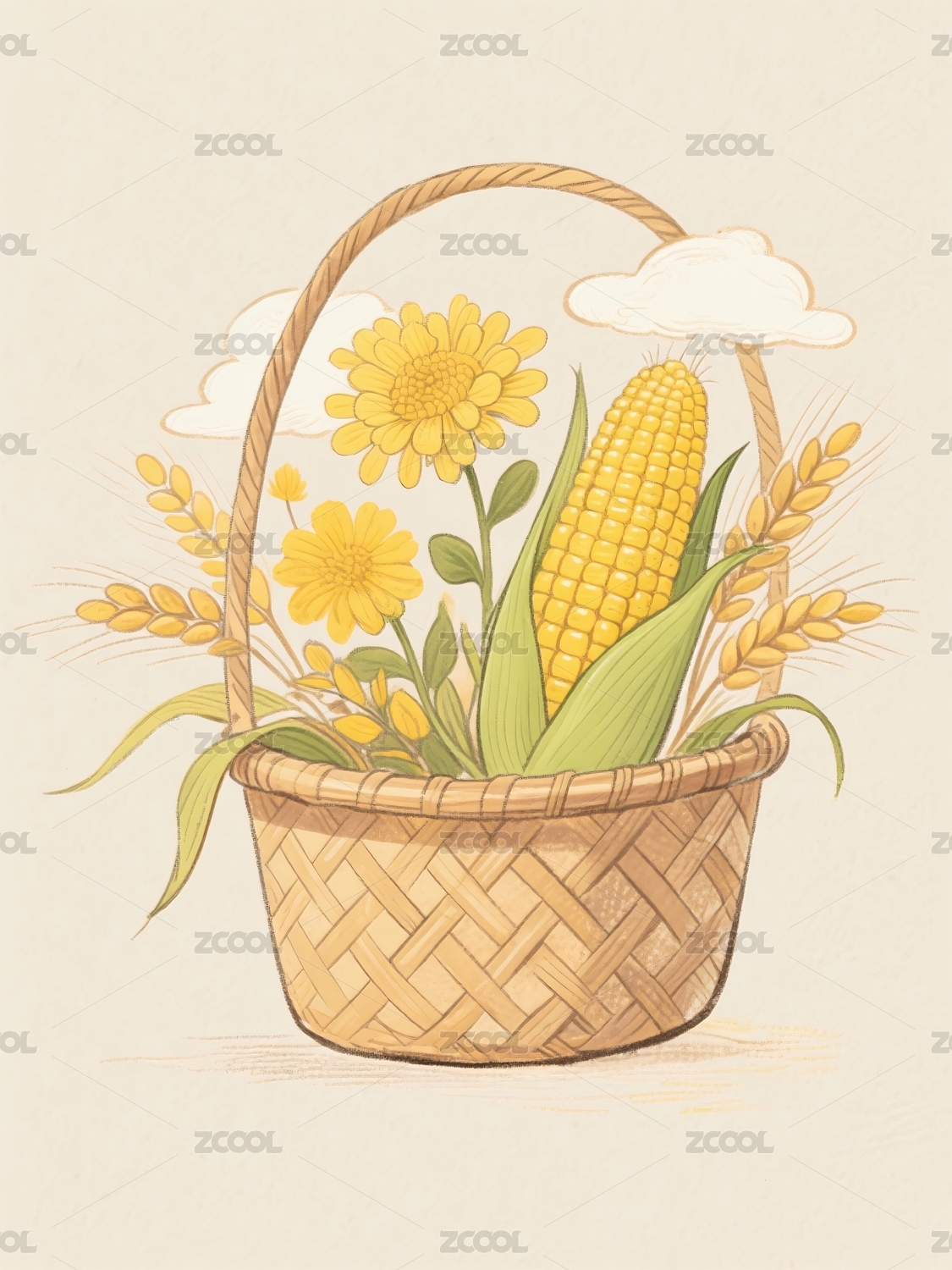 线条艺术风格绘制一个装满玉米、小麦和菊花