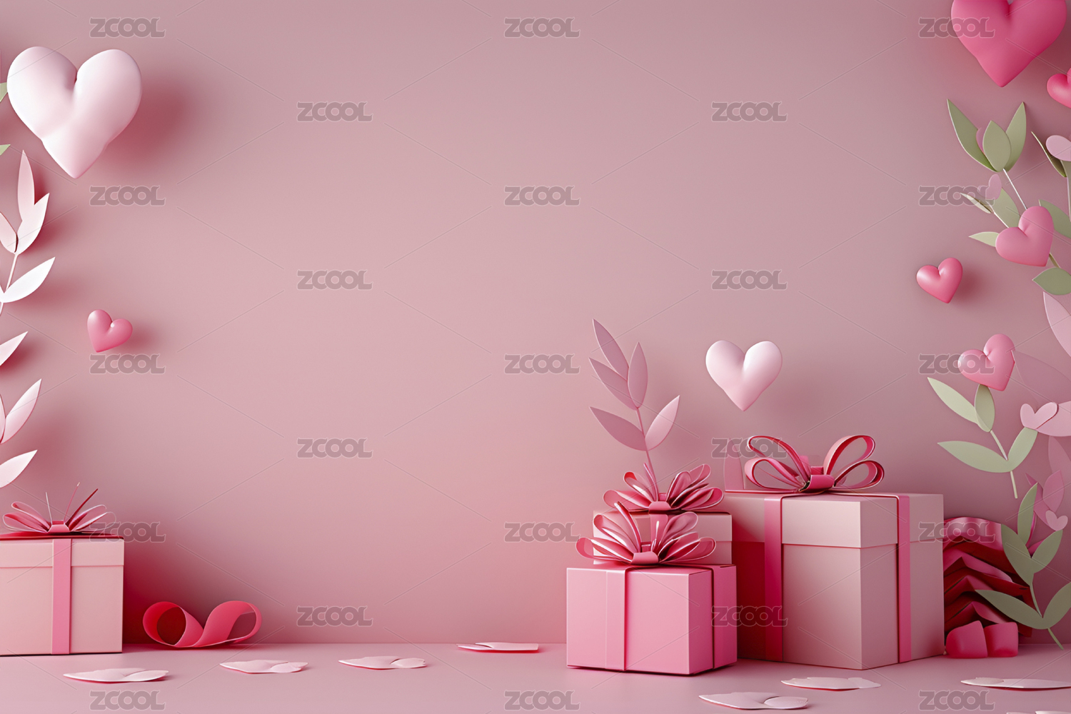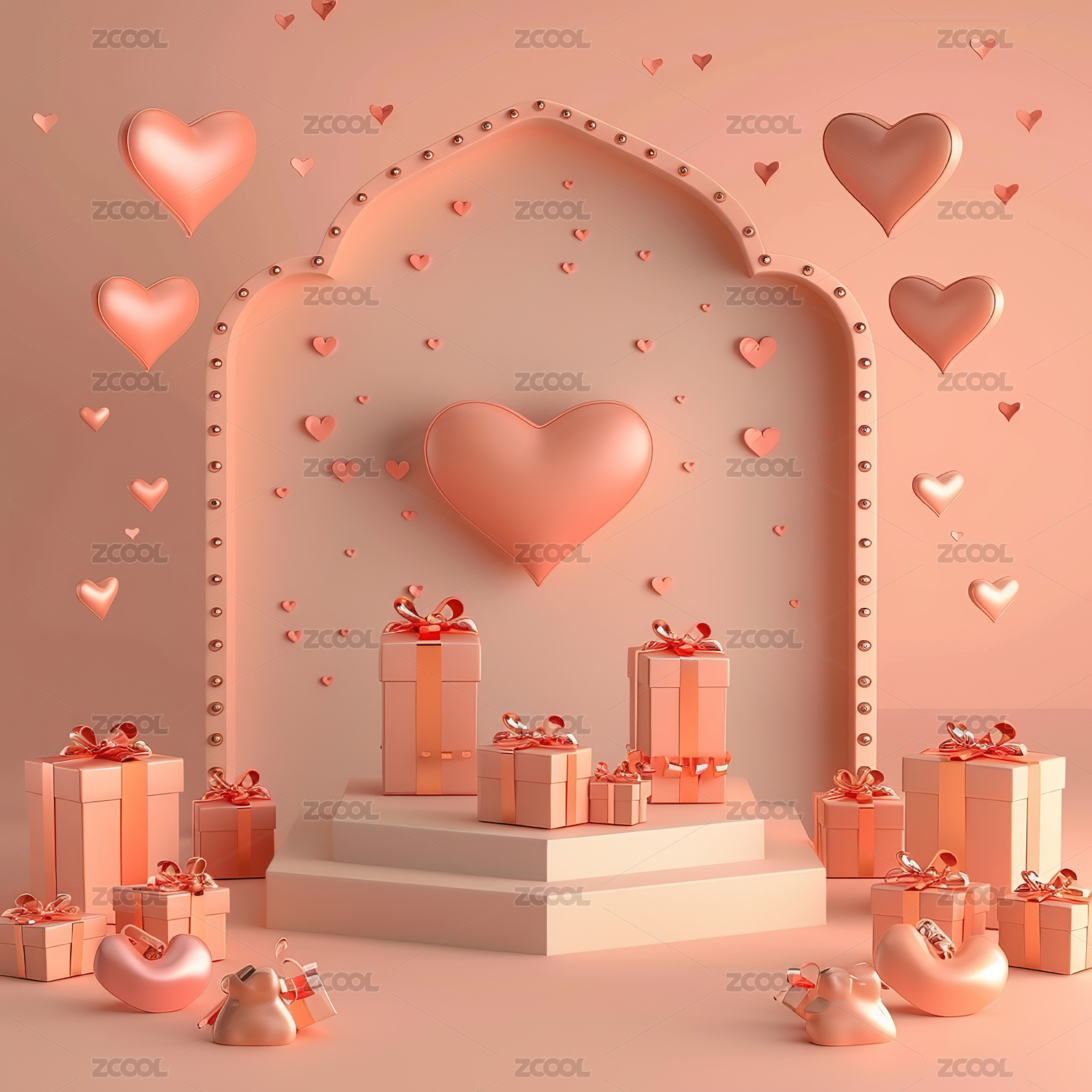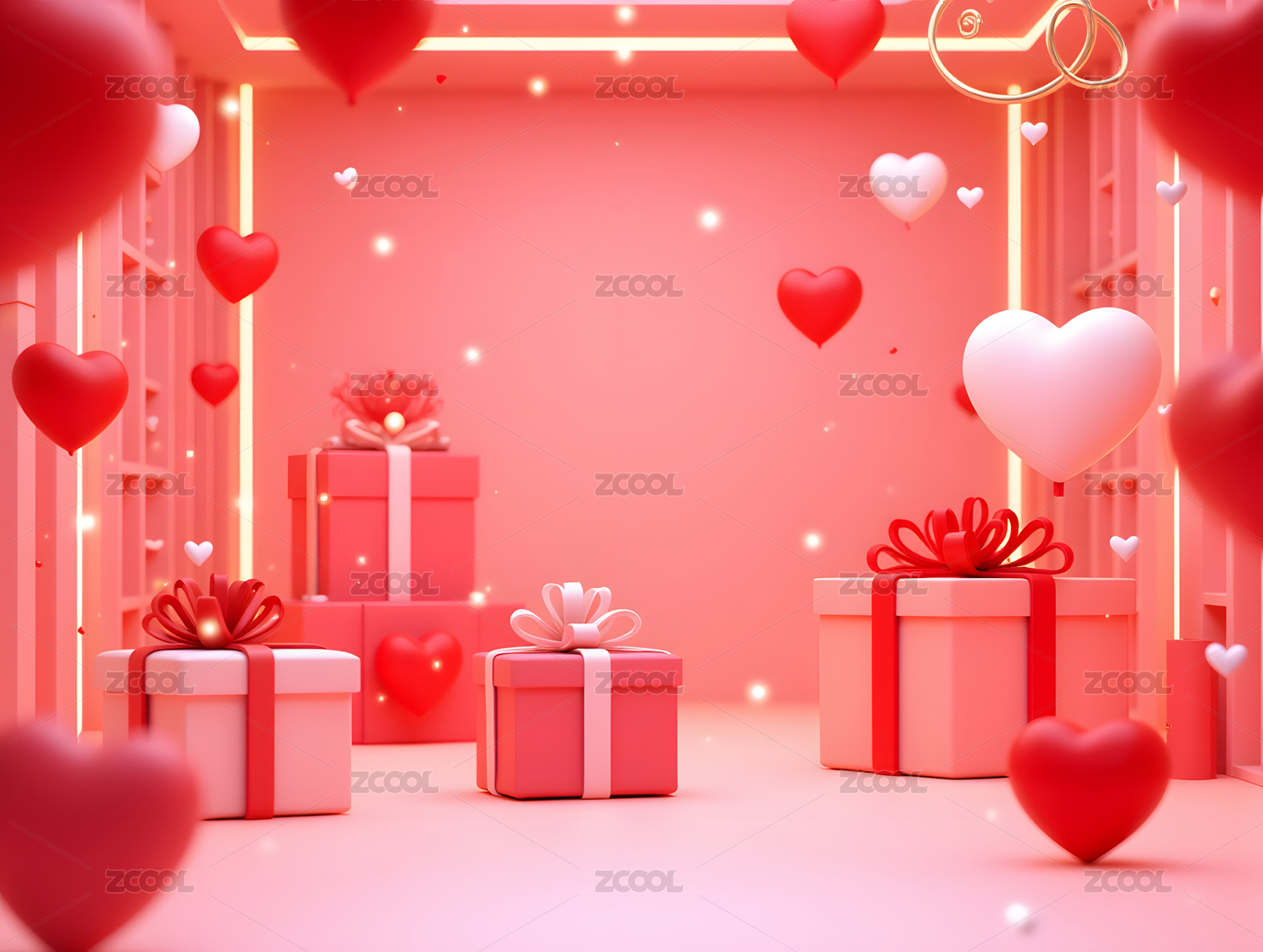 情人节爱心和礼物的三维渲染