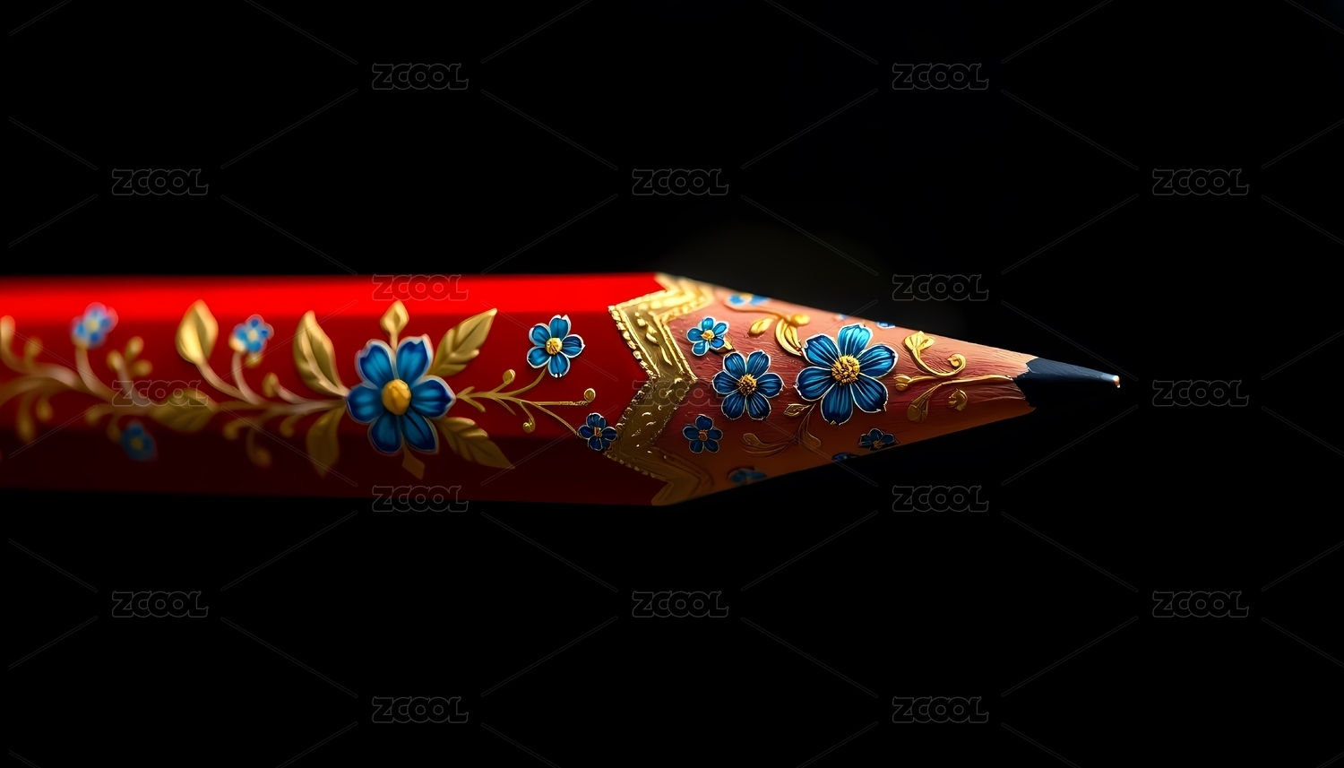 红铅笔上精美的蓝花金叶图案