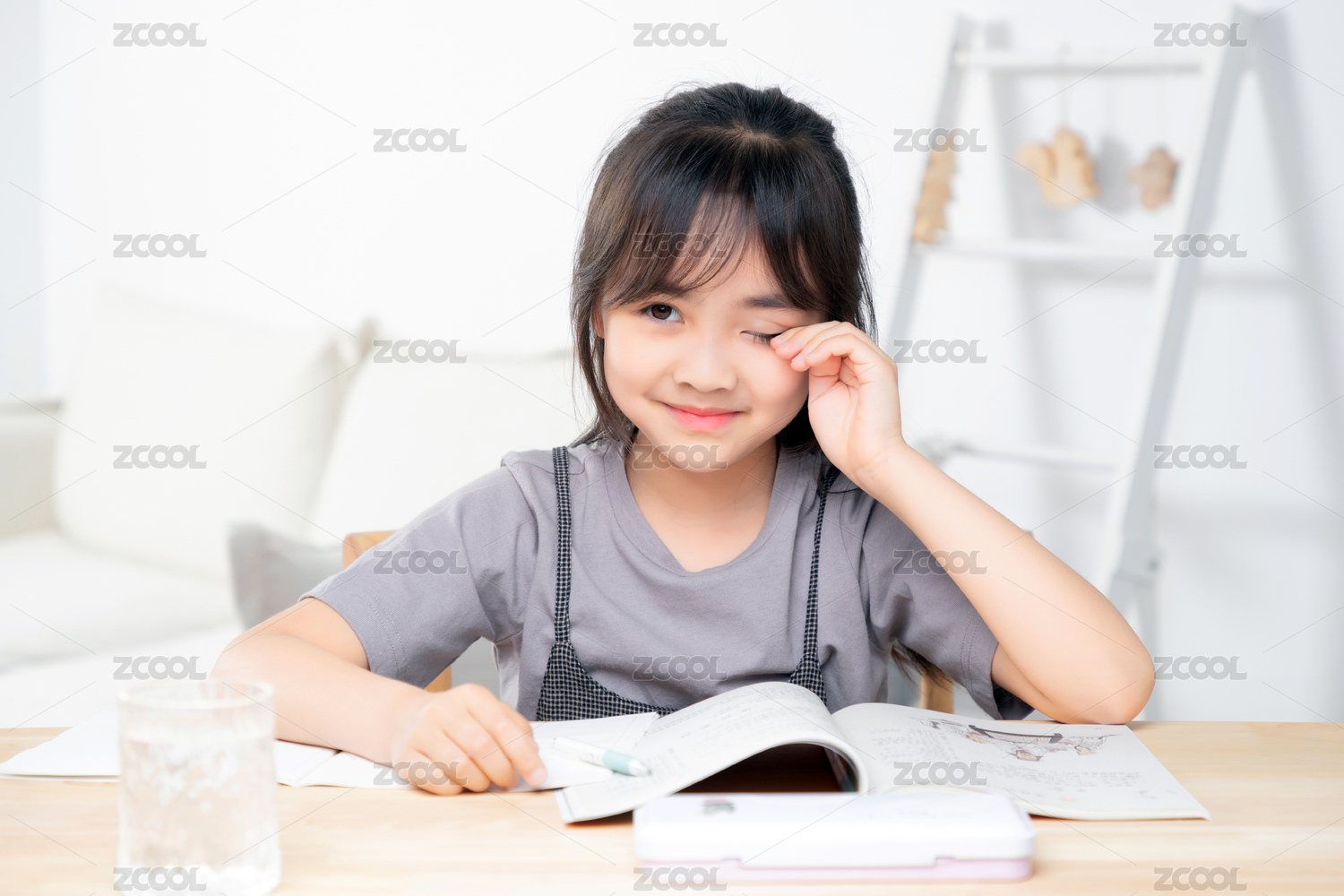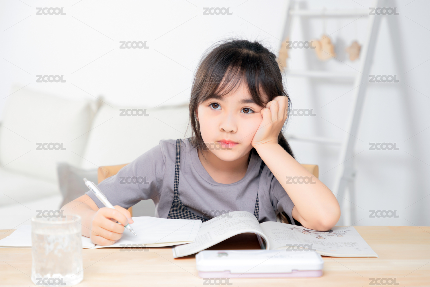 幸福可爱的小女孩做家庭作业在家里的客厅学习和书写英语类笔记本学习知识。