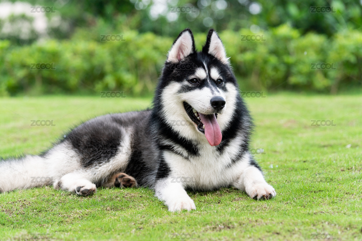 乖巧卧在草坪上的哈士奇
