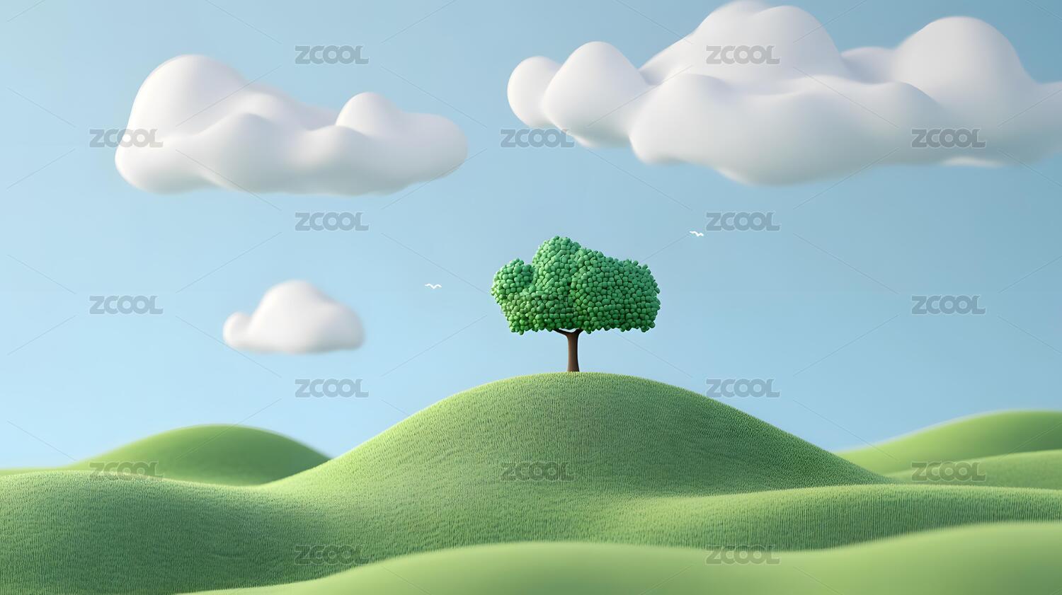 3D渲染的丘陵上有一棵树,还有云朵和鸟