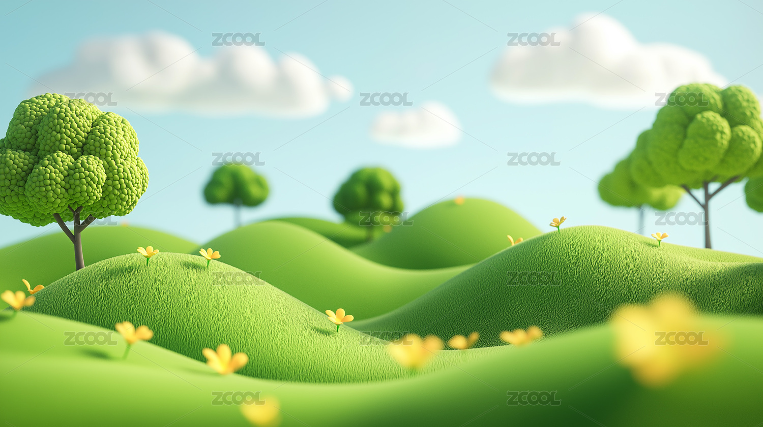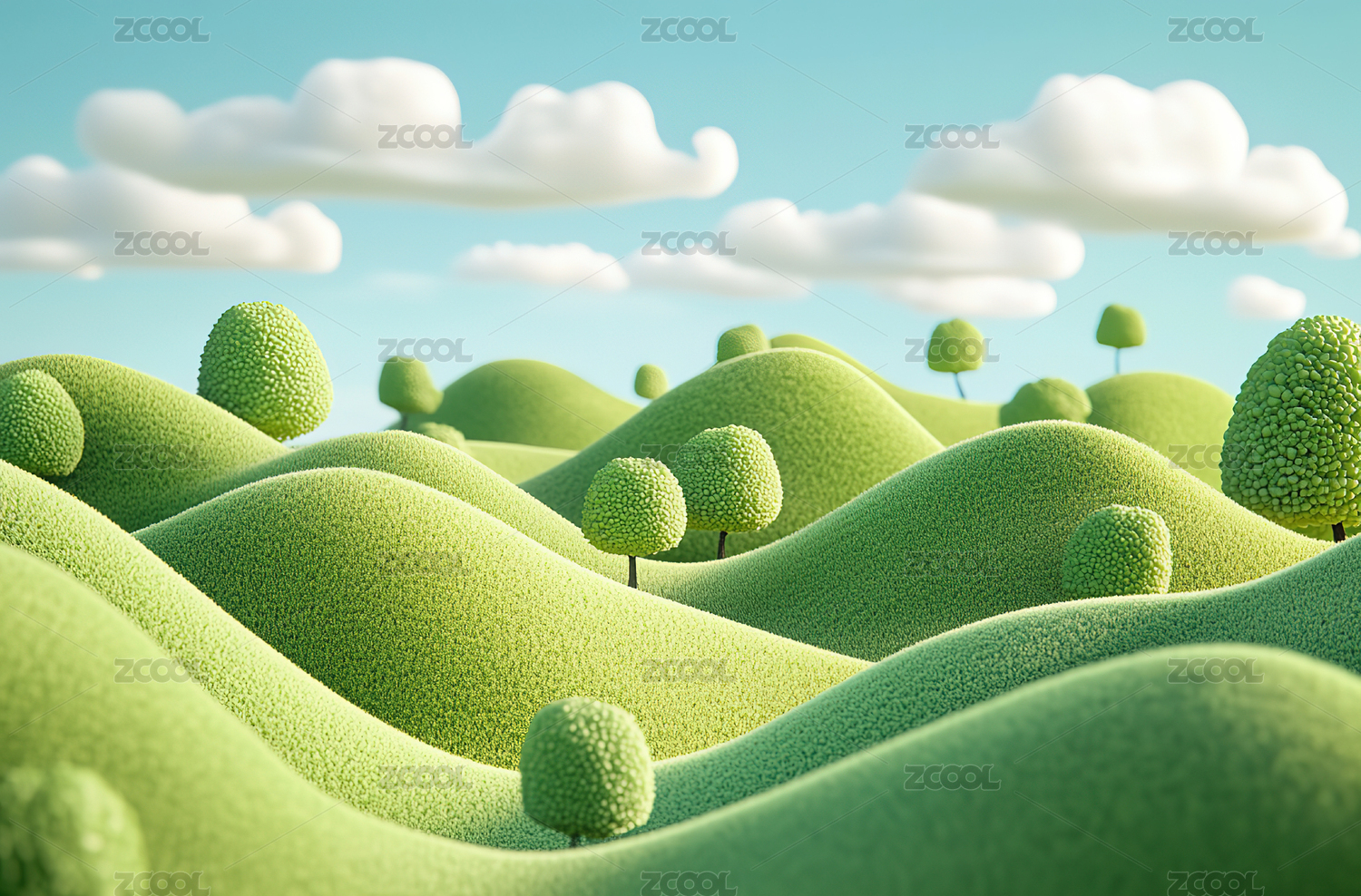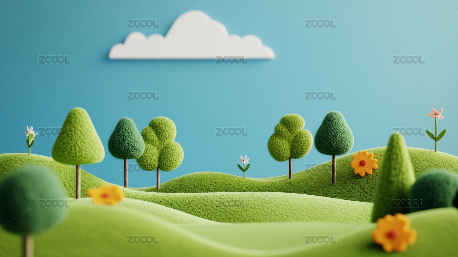绿色羊毛毡毛绒毛线田野3D卡通立体插画