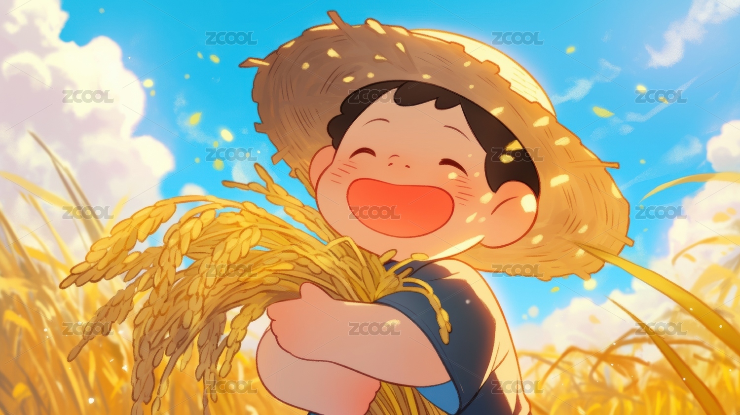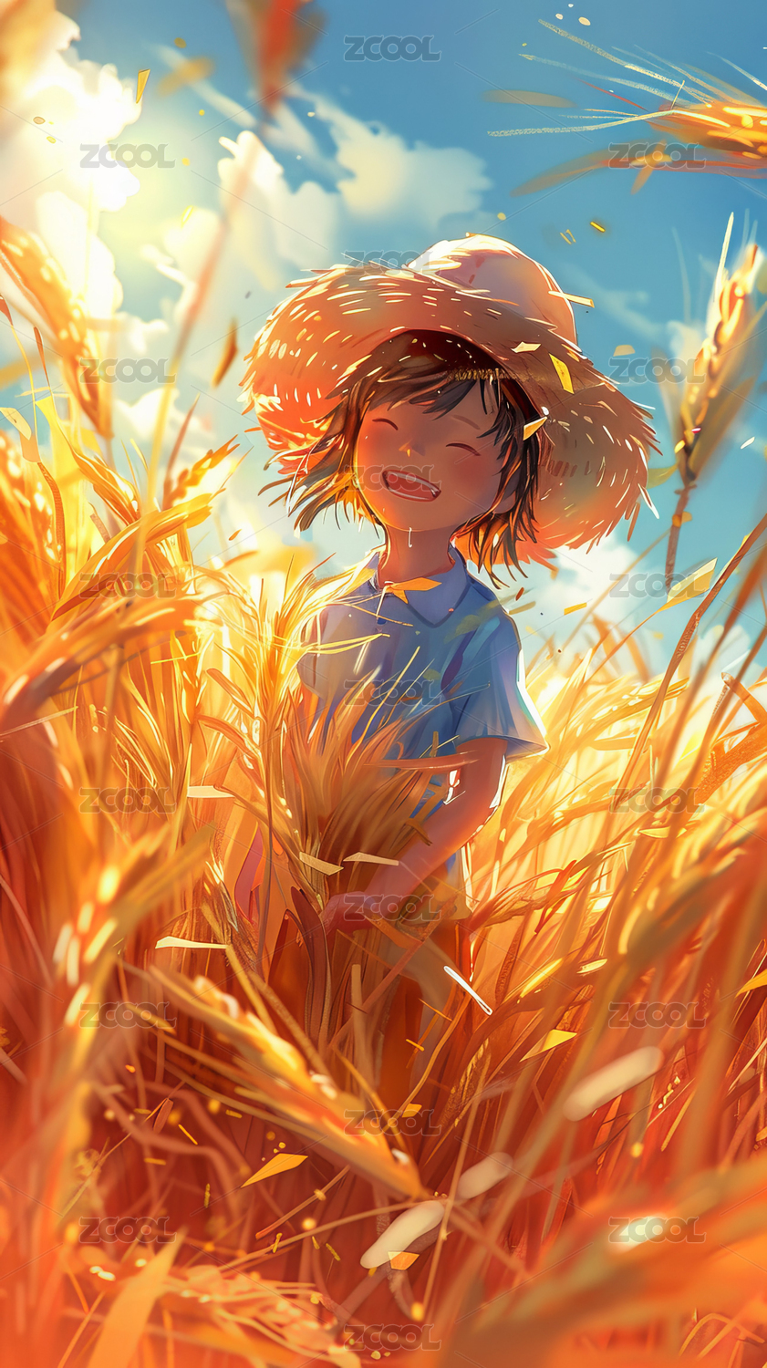 可爱的小女孩抱着麦穗在金黄的麦田里大笑