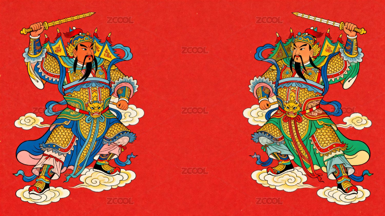中国传统门神画像红色背景