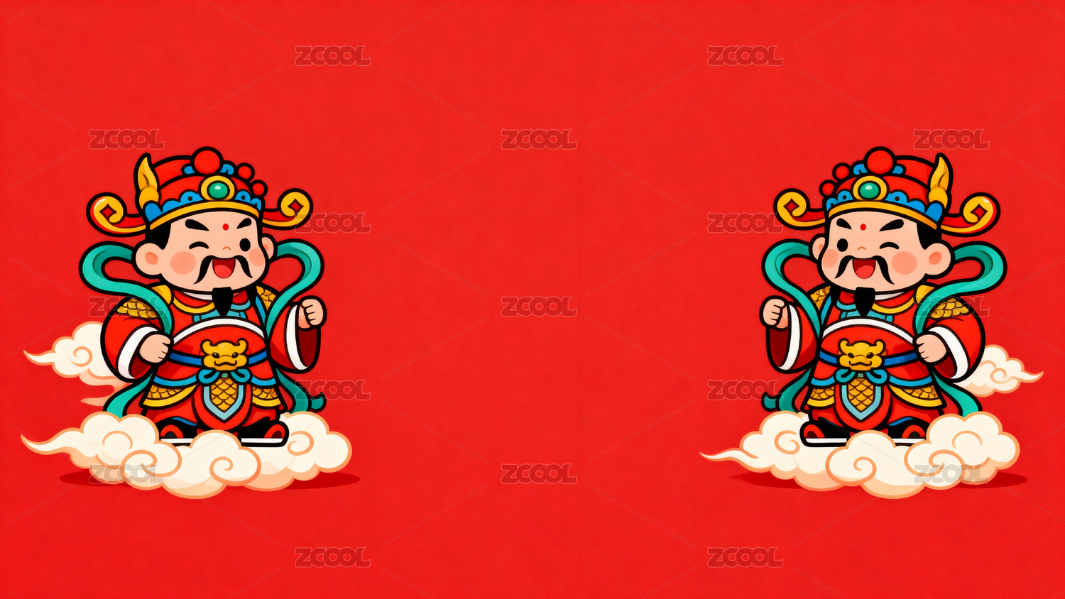 红色背景财神卡通形象并排
