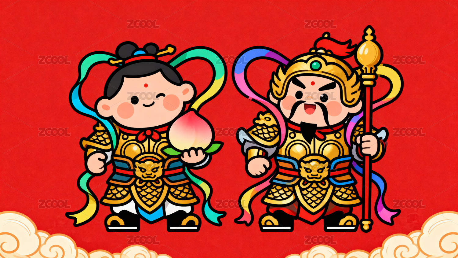 年兽门神大战红色贴图Q版插画素材横版