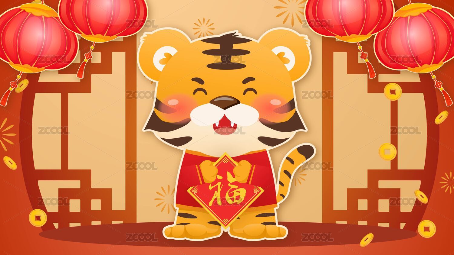 卡通老虎招财国潮插画