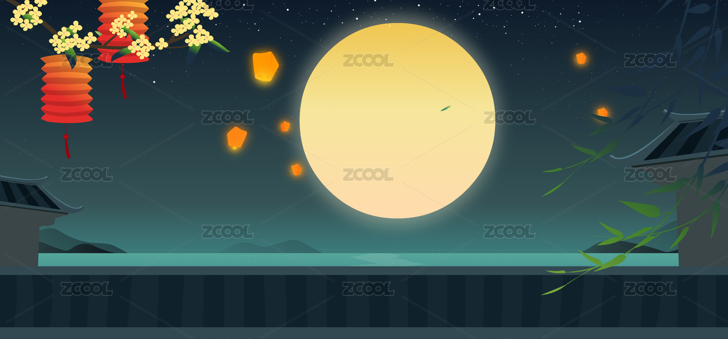 屋顶和大月亮的七夕中秋节