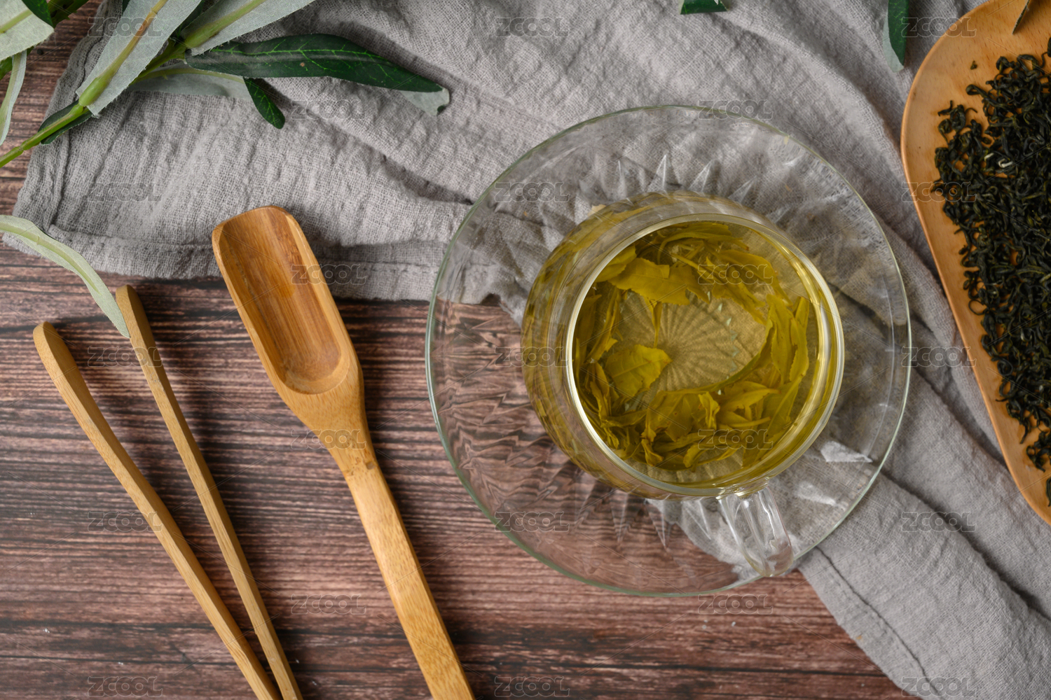 桌面上的玻璃杯子里的生津止渴的茉莉花绿茶