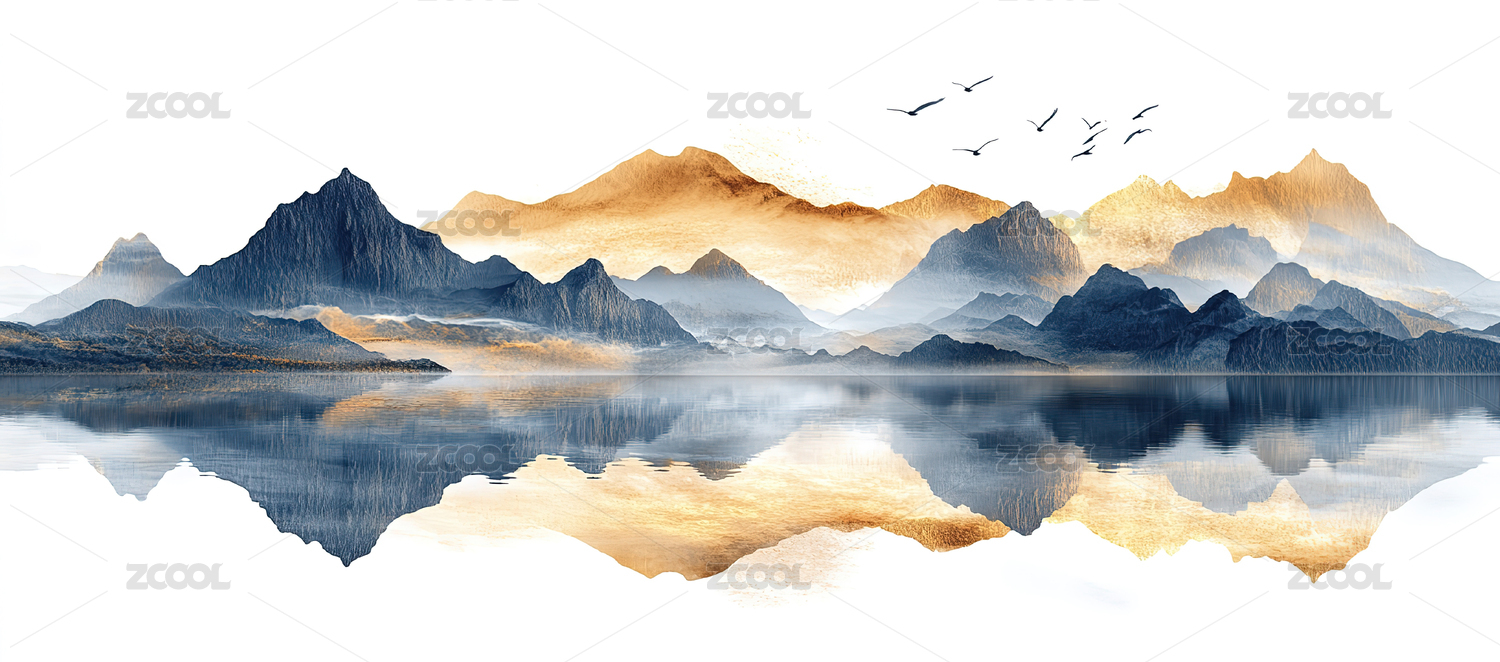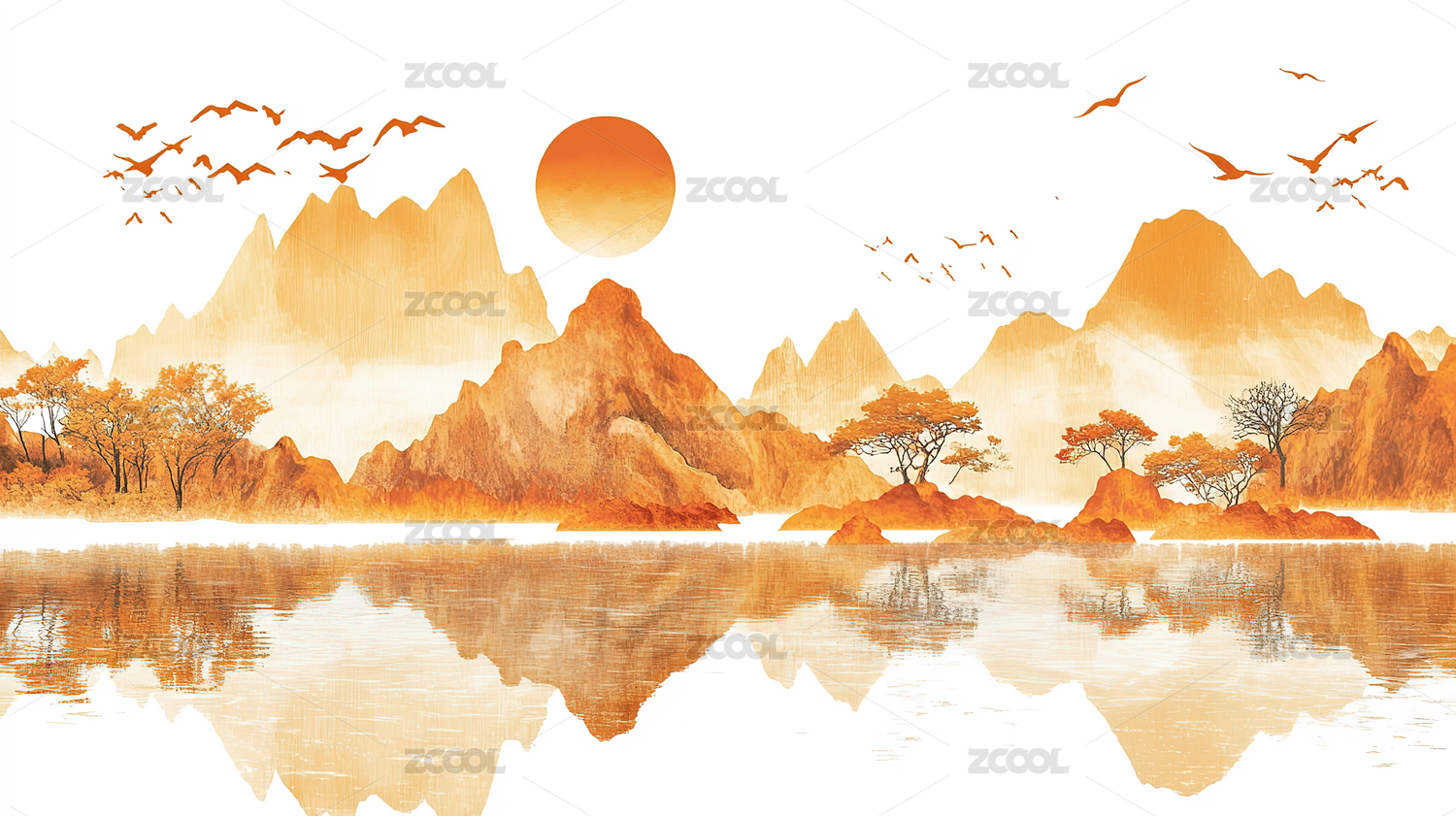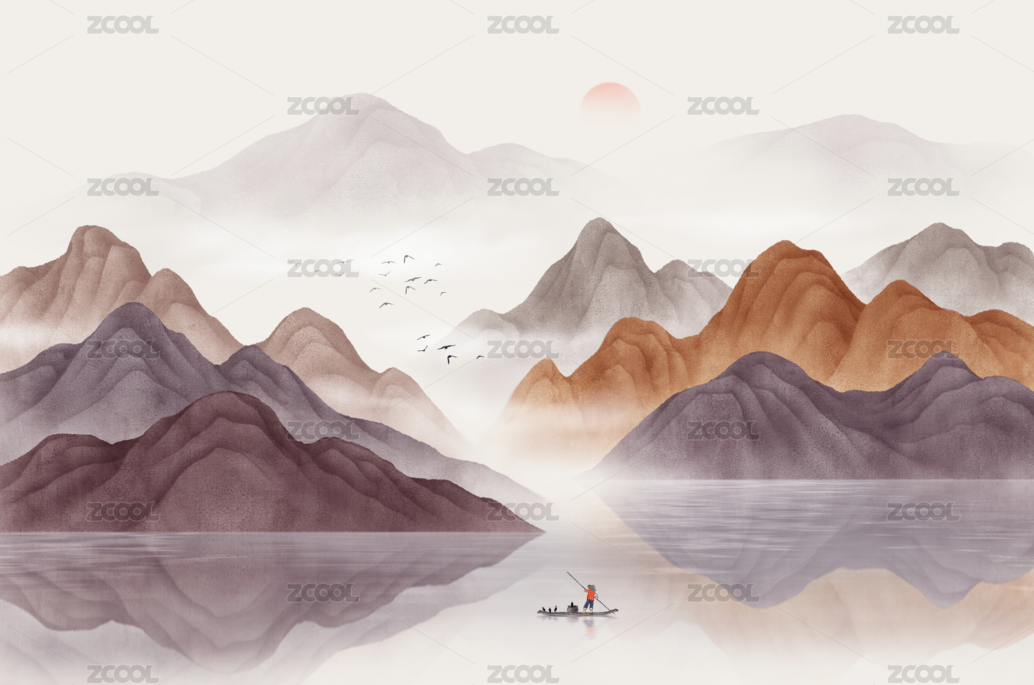 插画,山水,山水画,水墨画,山脉,风景,鸟类,装饰画,新中式风格,国风
