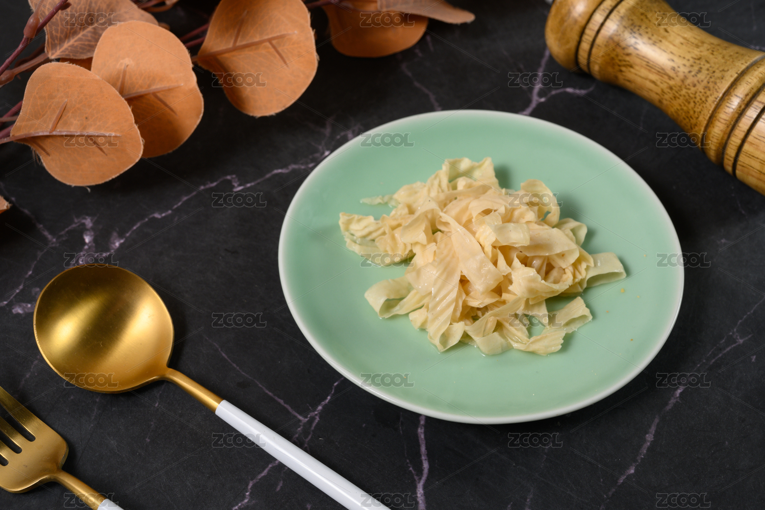 桌面上的盘子里的美味可口的泡发开的豆皮
