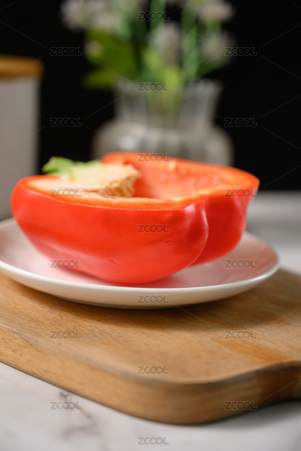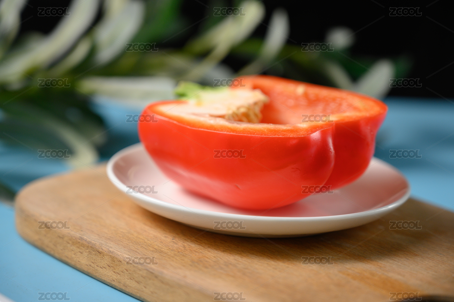 桌面上的盘子里的切开的红辣椒